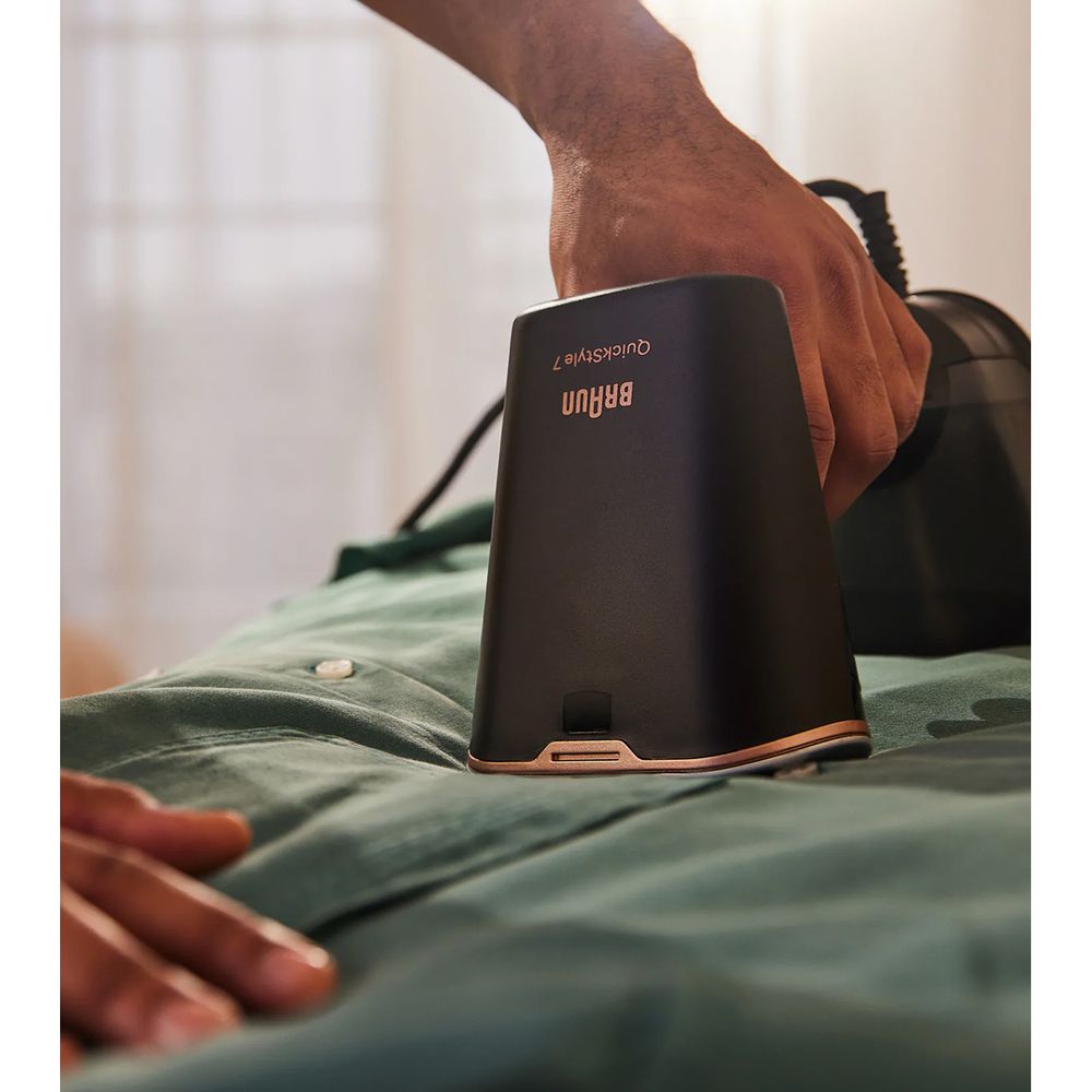 Σύστημα κάθετου σιδερώματος Braun QuickStyle 7 GS7077BK, με τεχνολογία FastSteam, ισχύ 1600 W, ρίψη 35 g/min συνεχούς ατμού, τεχνολογία iCare και σύστημα ActiClean Easy που προσφέρει γρήγορο και εύκολο καθαρισμό.