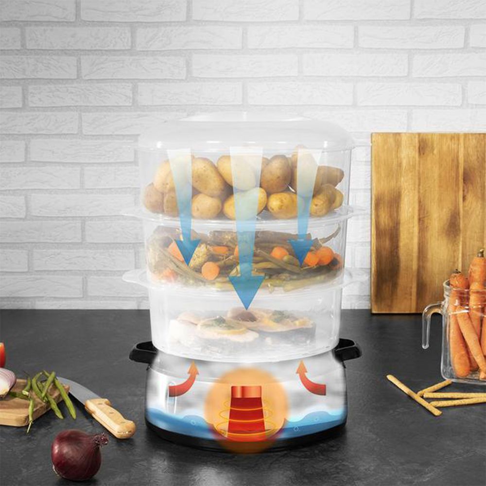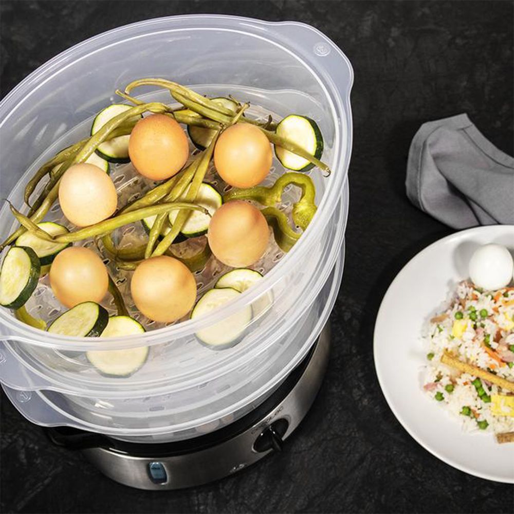 Με ισχύ 800W και κατασκευή από ανοξείδωτο ατσάλι, προσφέρει κορυφαία απόδοση και αντοχή. Τα 3 αποσπώμενα δοχεία συνολικής χωρητικότητας 9 λίτρων σου επιτρέπουν να μαγειρέψεις έως και 3 διαφορετικά πιάτα ταυτόχρονα για εσένα και τους αγαπημένους σου, ενώ τα ειδικά σχεδιασμένα πλέγματα εξασφαλίζουν το τέλειο μαγείρεμα αυγών. Με τη βοήθεια των ενδείξεων μπορείς να ελέγχεις τη διαδικασία μαγειρέματος σε όλα τα στάδια, ενώ με τον χρονοδιακόπτη έως 60 λεπτών έχεις την απόλυτη ευελιξία.