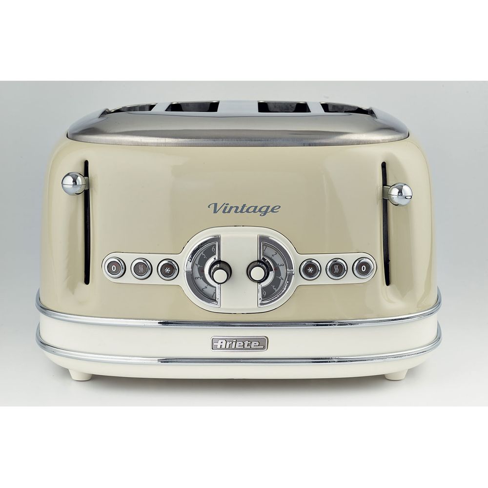Φρυγανιέρα Ariete 0156/03 Vintage Beige ισχύος 1600W, με μεταλλικό σώμα, λειτουργία ακύρωσης, απόψυξης και θέρμανσης, και inox φινίρισμα. Μπορεί να ψήσει ταυτόχρονα 4 φέτες, αλλά και 2x2 ξεχωριστά.