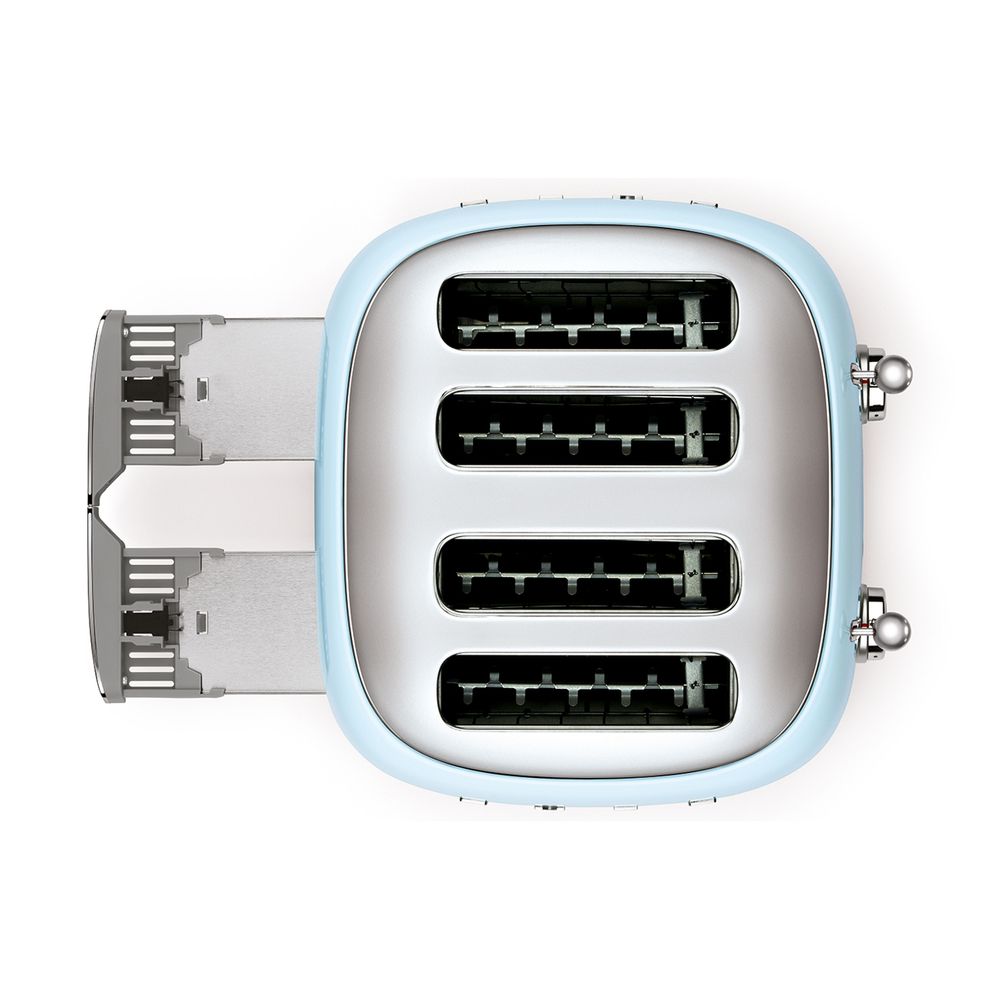 Φρυγανιέρα 4ων υποδοχών SMEG με αισθητική Style της δεκαετίας του '50, συνολική χωρητικότητα 4 φέτες και διπλό μηχανισμό, για ταυτόχρονη χρήση διαφόρων λειτουργιών και επιπέδων φρυγανίσματος. Αυτό την καθιστά ιδανική για μεγάλες οικογένειες ή για την προετοιμασία διαφορετικών τύπων ψωμιού εξοικονομώντας χρόνο.