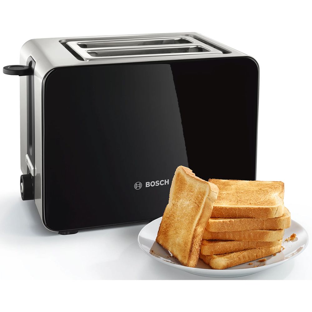 Φρυγανιέρα Bosch με ενσωματωμένες αντιστάσεις φρυγανίσματος, λειτουργία ξεπαγώματος και προθέρμανσης, αυτόματο κεντράρισμα για ομοιόμορφο φρυγάνισμα και αυτόματη απενεργοποίηση.