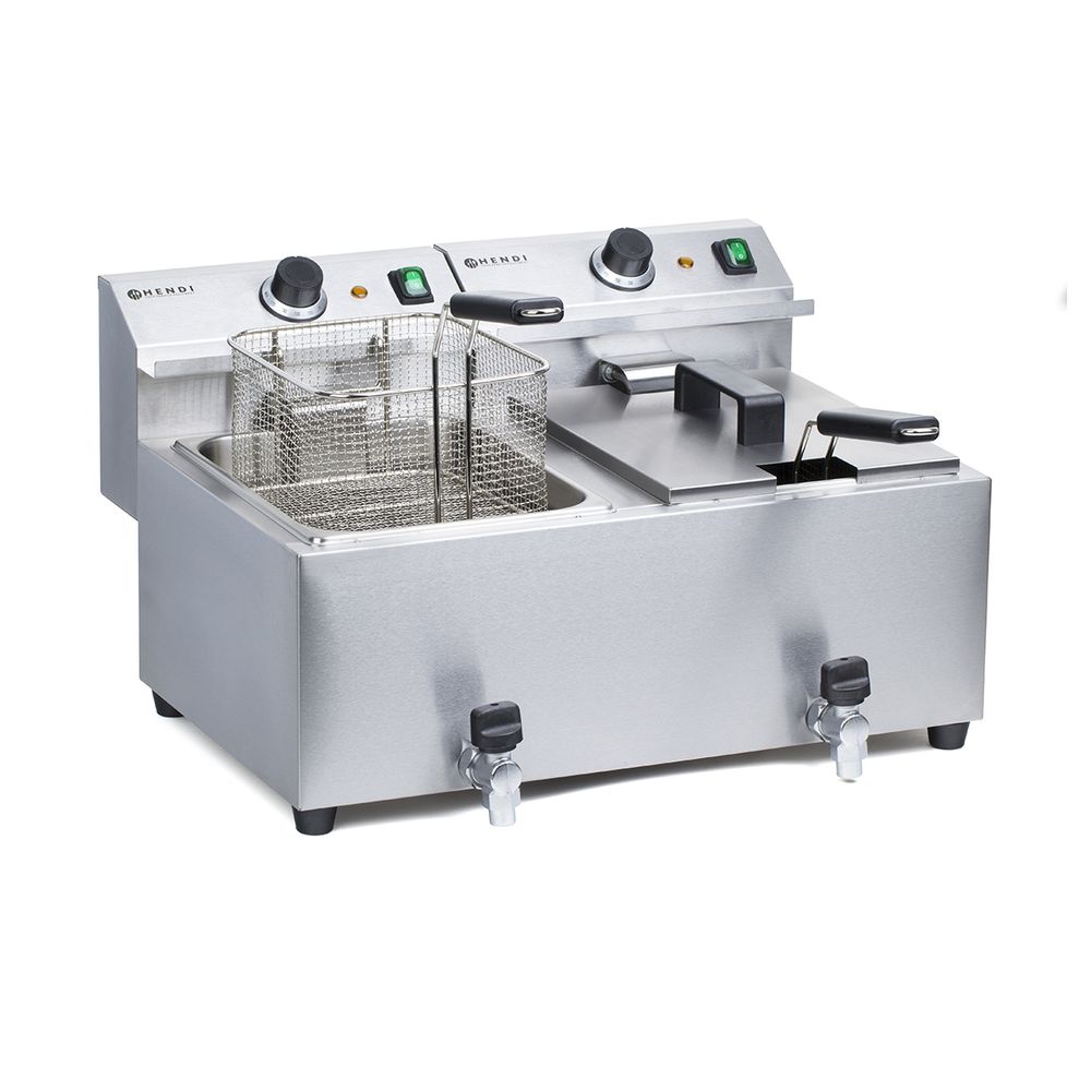 Ηλεκτρική φριτέζα με περίβλημα και δοχείο λαδιού από ανοξείδωτο ατσάλι, με βρυσάκι αποστράγγισης, αφαιρούμενο στοιχείο με λειτουργία απενεργοποίησης όταν αφαιρείται, θερμοστάτη ασφαλείας και προστασία κατά της υπερθέρμανσης.