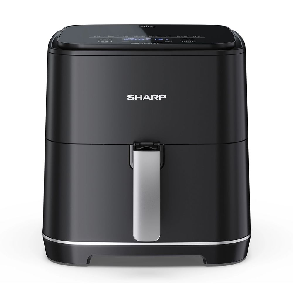 Φριτέζα αέρα Sharp AF-GS552AE-B με χωρητικότητα 5.5 lt, ισχύ 1650 W, 2 λειτουργίες μαγειρέματος, 8 προκαθορισμένα προγράμματα και αξεσουάρ κατάλληλα για πλυντήριο πιάτων.