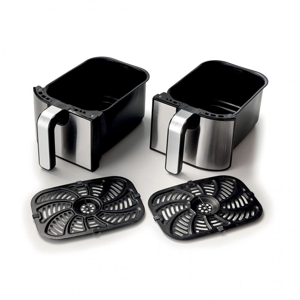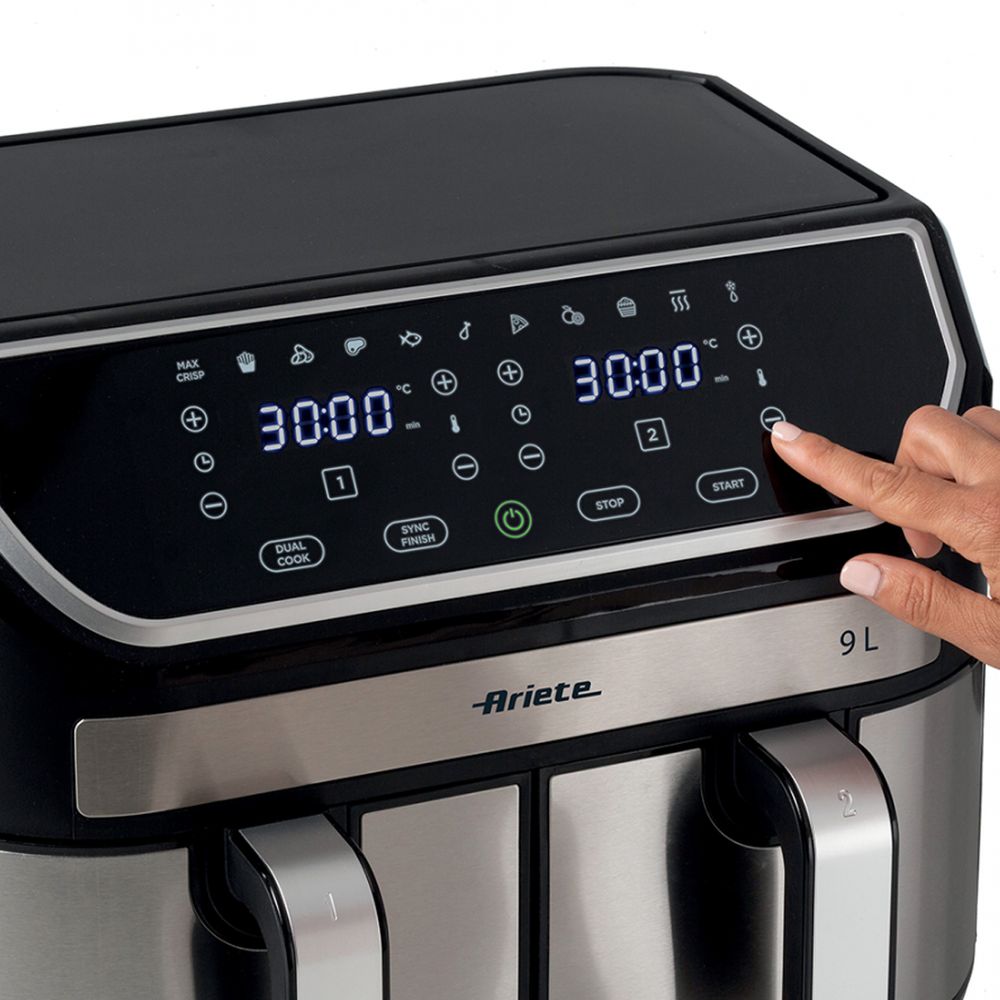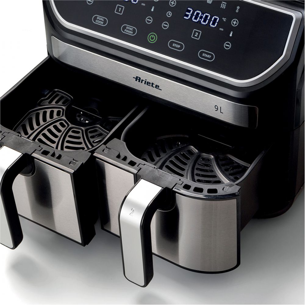 Εξόπλισε τον πάγκο της κουζίνας σου με το Air fryer 4625 της Ariete. Το μόνο που έχεις να κάνεις είναι να τοποθετήσεις τα τρόφιμα στο άνετο εσωτερικό των 2 καλαθιών χωρητικότητας 4.5Lt και να επιλέξεις ένα από τα 11 προκαθορισμένα προγράμματα για να μην ψάχνεσαι με τις ρυθμίσεις! Έτσι, μπορείς να μαγειρεύεις δύο φαγητά ταυτόχρονα! Επιπλέον, χρησιμοποίησε το πρόγραμμα αποξήρανσης για να δημιουργήσεις υγιεινά σνακ!