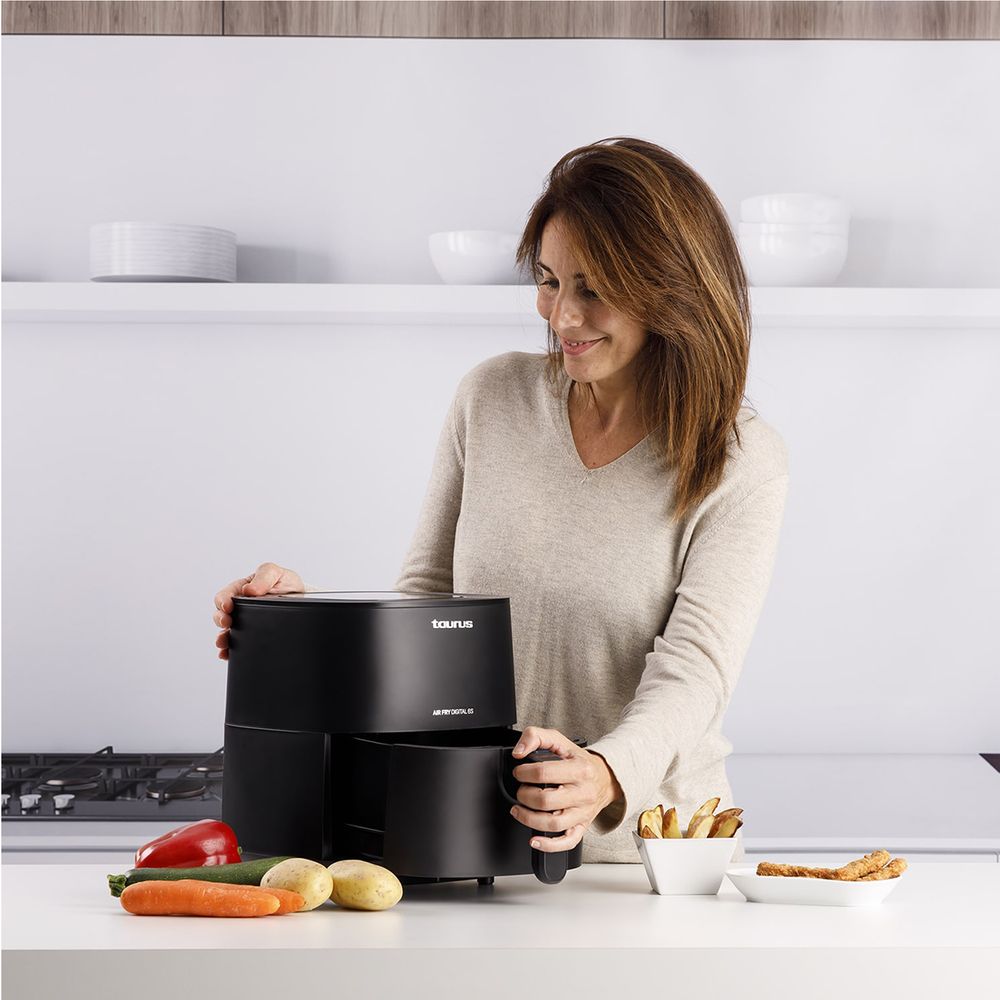 Φριτέζα Αέρα AF1700D Digital XL από την εταιρεία Taurus εξοπλισμένη με τεχνολογία Air System Tech, ισχύς 1700W, χωρητικότητα 5,5 λίτρων και ψηφιακή οθόνη αφής με 8 προκαθορισμένα προγράμματα. Επιπλέον διαθέτει ρυθμιζόμενη θερμοκρασία 80ºC - 200ªC, αποσπώμενο κάδο με αντικολλητική επίστρωση, χρονοδιακόπτη 60 λεπτών καθώς και ακουστικό σήμα για τέλος του χρόνου ψησίματος.
