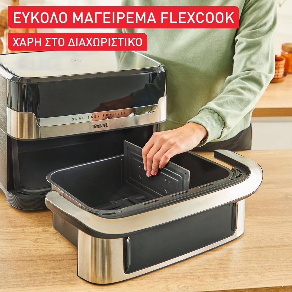Ανακάλυψε τη φριτέζα αέρος Tefal Dual Easy Fry Flex EY922DE0 και δώσε νέα διάσταση στο καθημερινό σου μαγείρεμα! Με δύο ανεξάρτητες ζώνες και το έξυπνο διαχωριστικό FlexCook, εσύ επιλέγεις πώς θα μαγειρέψεις. Ετοίμασε διαφορετικά φαγητά ταυτόχρονα ή χρησιμοποίησε την ενιαία GiantZone για μεγάλες μερίδες. Απόλυτος έλεγχος χρόνου και θερμοκρασίας, εύκολη χρήση και ιδανικό αποτέλεσμα κάθε φορά. Ιδανική για οικογενειακά τραπέζια και πολυάσχολες κουζίνες!