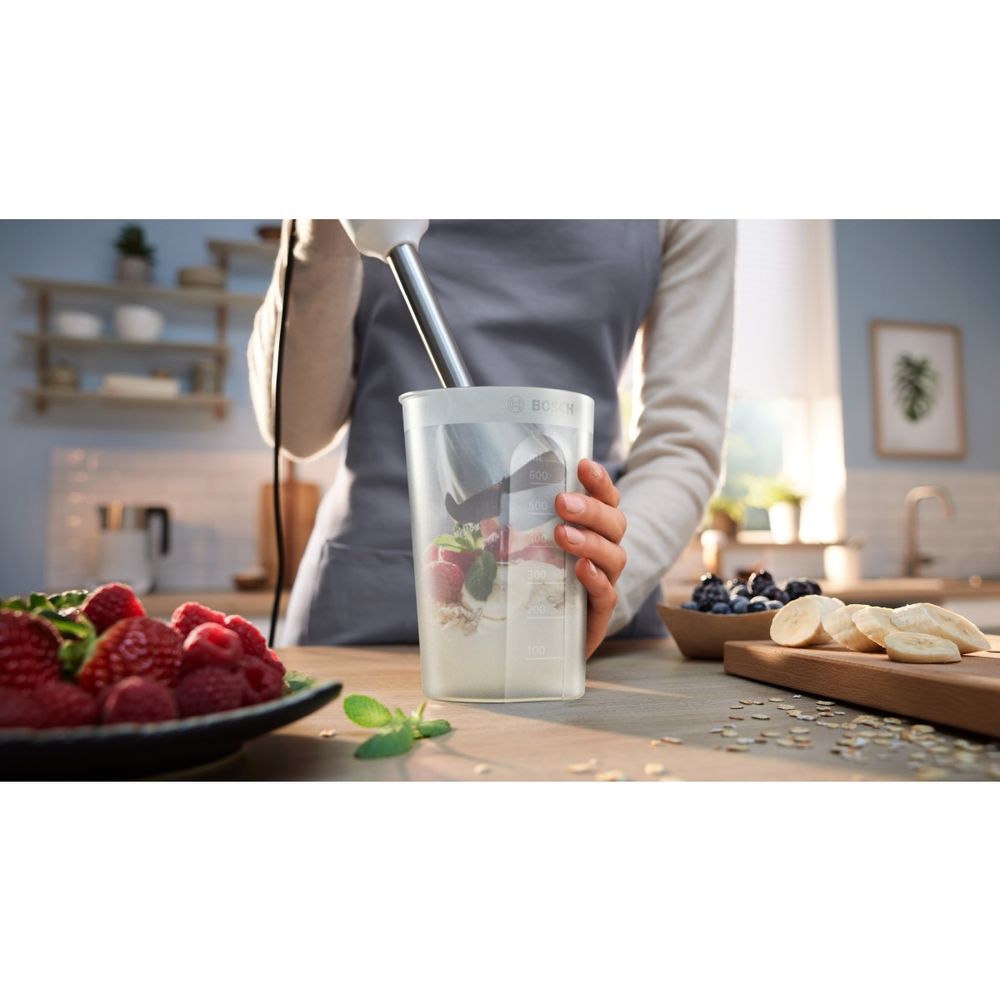 Ραβδομπλέντερ Bosch με κινητήρα Performance drive 800 που εξασφαλίζει ισχυρή απόδοση, Dynamic speed control για να ρυθμίζεις εύκολα την ταχύτητα, 4 λεπίδες με QuattroBlade σύστημα και AntiSplash για τέλεια κοπή και ανάμειξη.