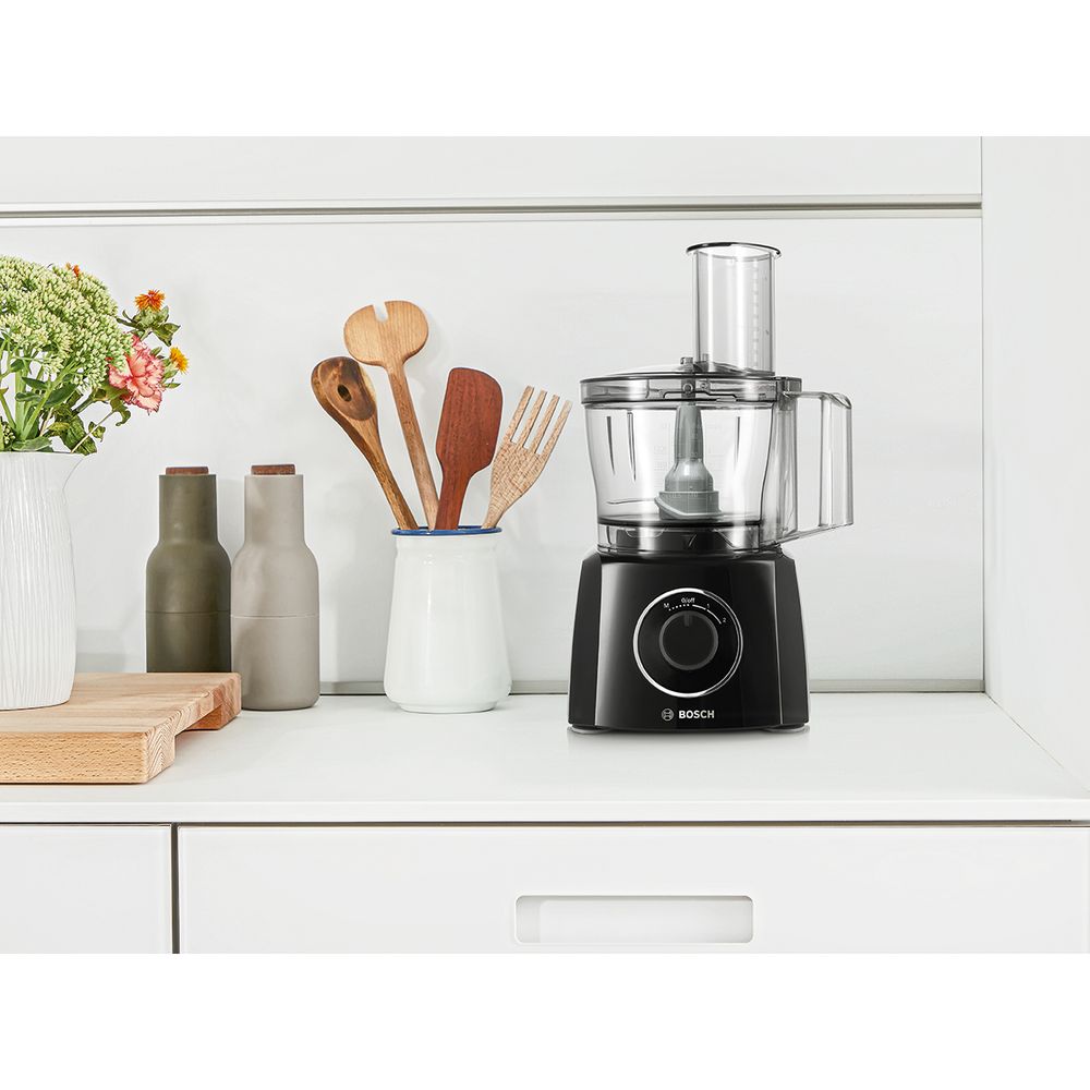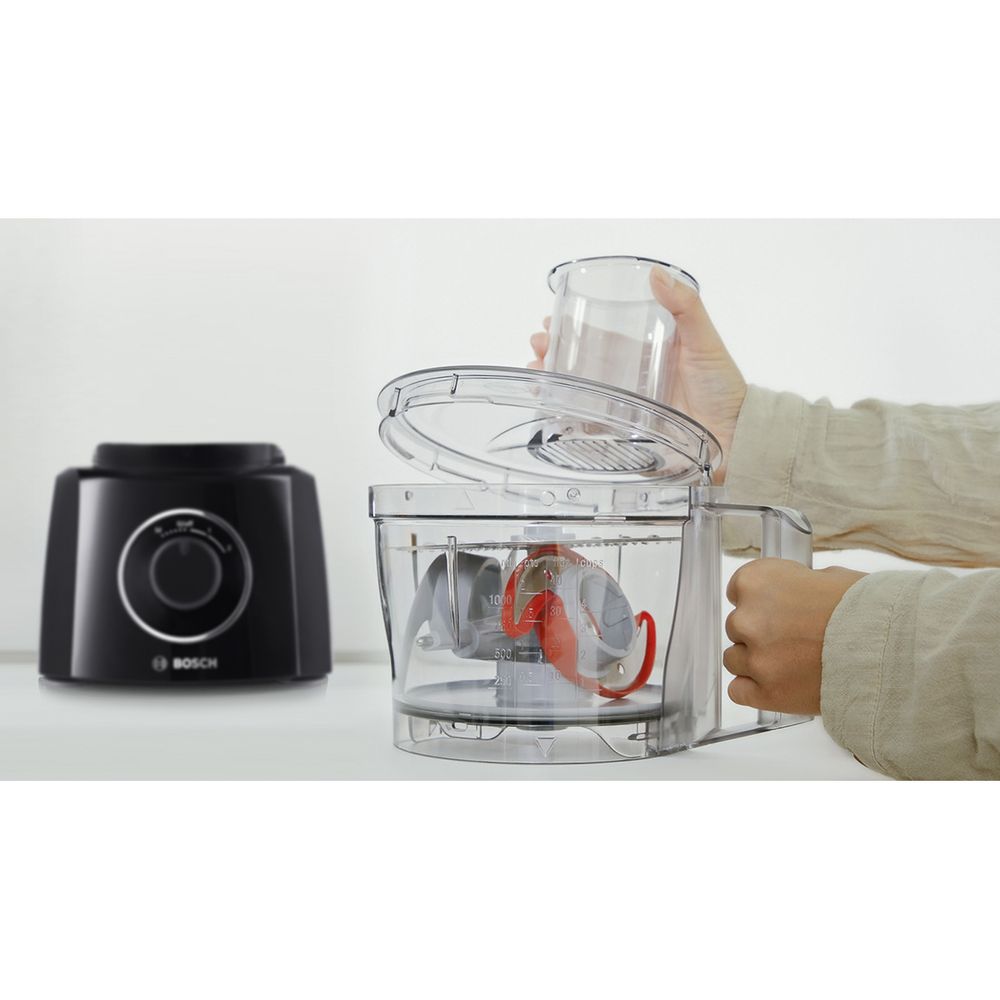Πολυμίξερ Bosch με ισχύ 800W, ισχυρό κινητήρα με 2 ρυθμίσεις ταχύτητας και λειτουργία στιγμιαίας δυνατής ταχύτητας, διαφανές πλαστικό μπολ 2.3 lt, πολυλειτουργικό μαχαίρι και ειδικό μαχαίρι MultiLevel 6, έξυπνη αποθήκευση εξαρτημάτων στο μπολ και δυνατότητα καθαρισμού στο πλυντήριο πιάτων.