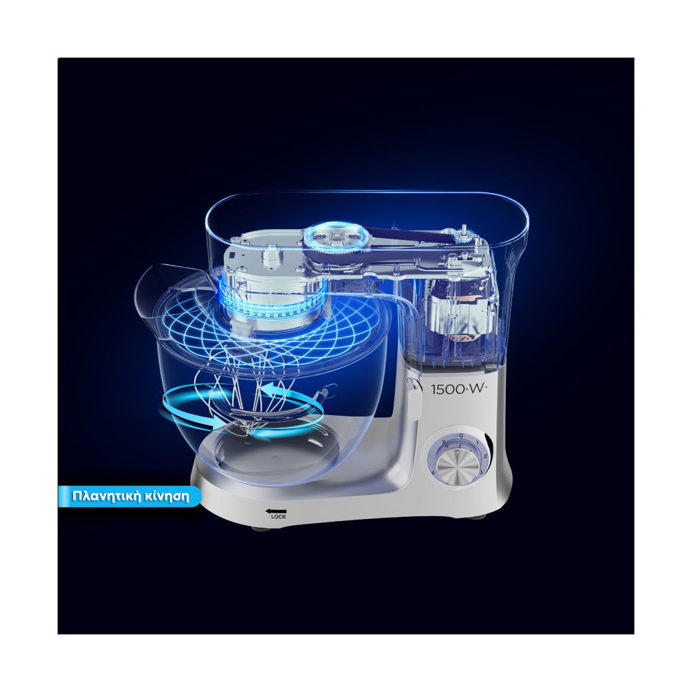 Διαθέτει XL ανοξείδωτο μπολ 8 L, 4 εξαρτήματα, διπλούς γάντζους ζυμώματος για απόλυτο αποτέλεσμα, αναδευτήρα/αβγοδάρτη, 6 ταχύτητες + PULSE, καπάκι κάλυψης μπολ, πλανητική κίνηση αναδευτήρων και αντιολισθητική βάση.