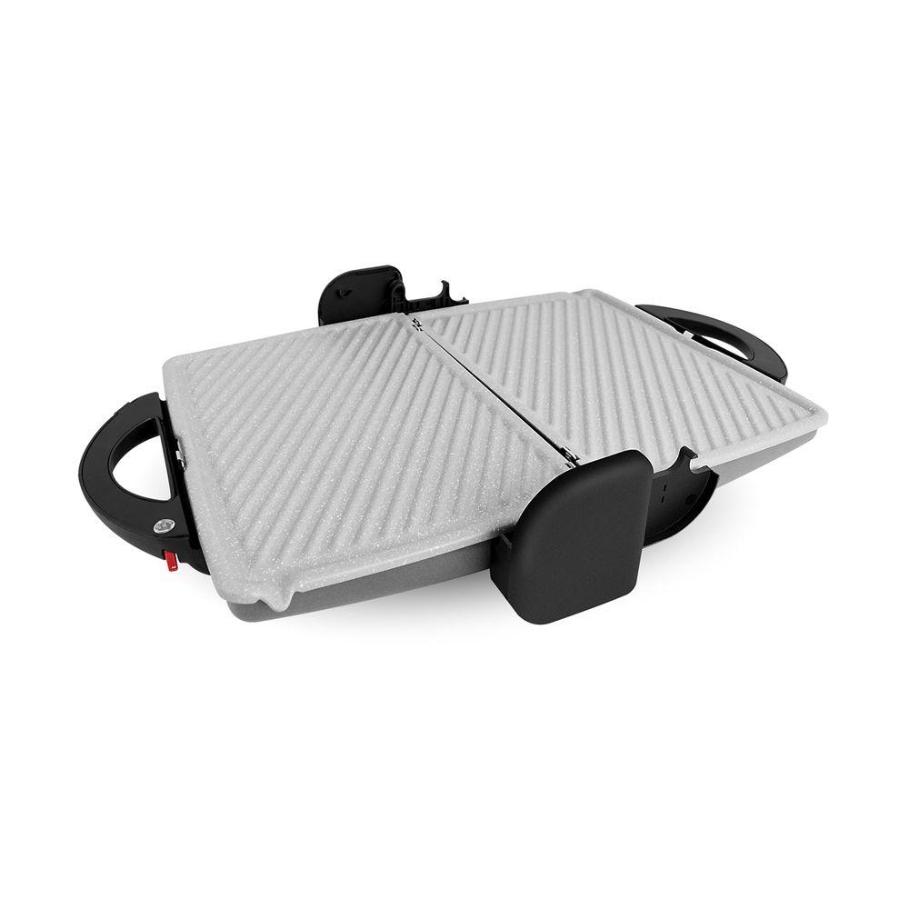 αντικολλητικές κεραμικές πλάκες για εύκολο καθάρισμα, ειδικά σχεδιασμένες πλάκες με κανάλι αποστράγγισης για απομάκρυνση λίπους, ρυθμιζόμενος θερμοστάτης 5 θέσεων, ένδειξη λειτουργίας και ετοιμότητας, 3 θέσεις ψησίματος (τοστιέρα, γριλιέρα, ψηστιέρα-άνοιγμα 180⁰), ΧL επιφάνεια ψησίματος: 244x330cm