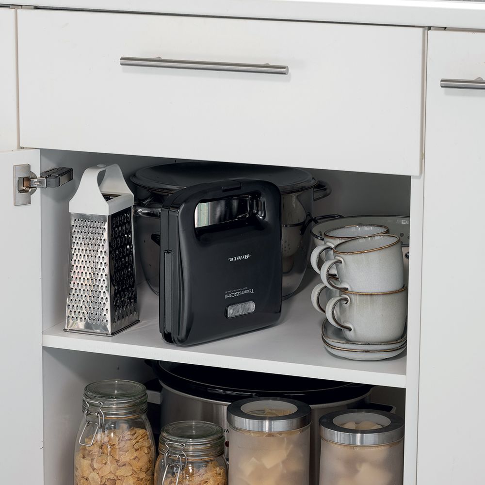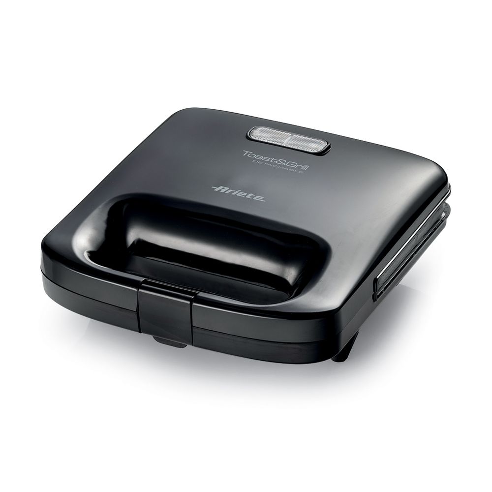 Τοστιέρα Ariete με αντικολλητικές πλάκες, ενσωματωμένο θερμοστάτη, ένδειξη λειτουργίας και ετοιμότητας και χωρητικότητα 2 τοστ. Με αποθηκευτικό χώρο καλωδίου στη βάση και δυνατότητα κάθετης αποθήκευσης για εξοικονόμηση χώρου.