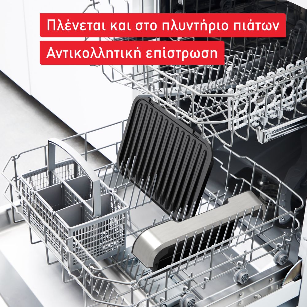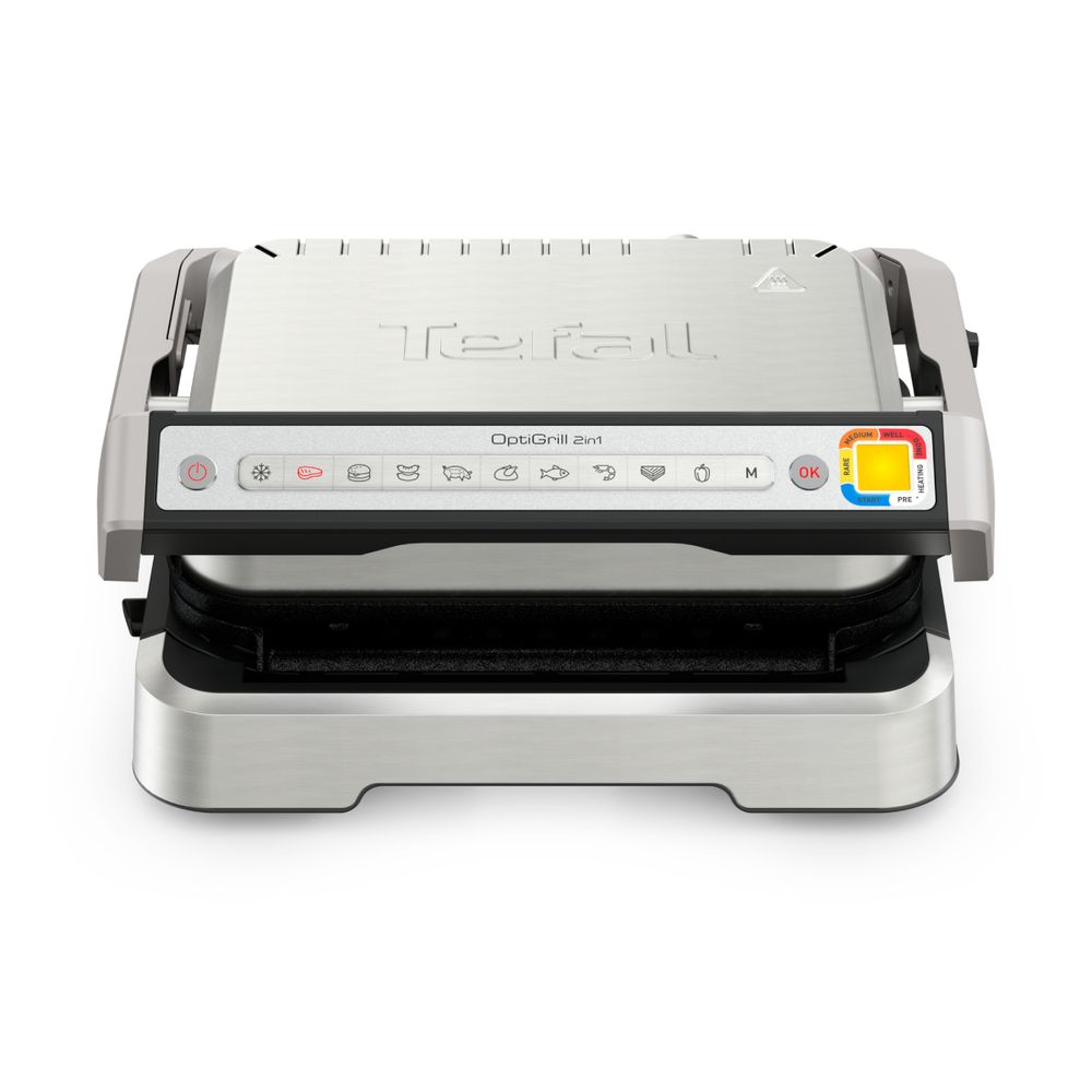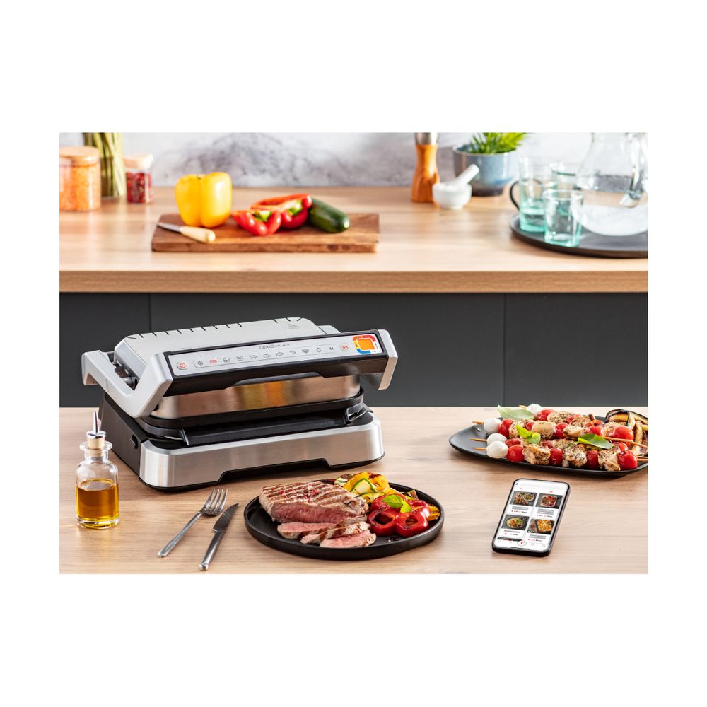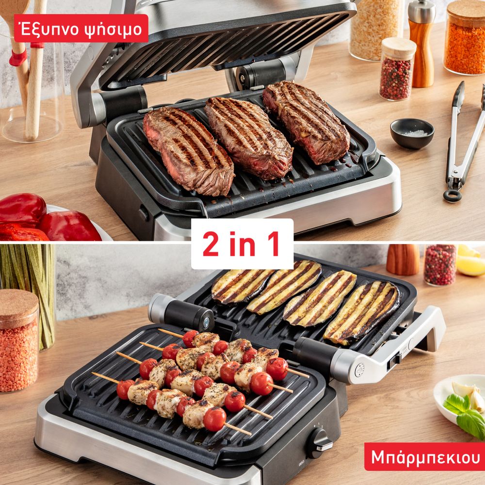 Αντικολλητικές πλάκες, Συσκευή 2 σε 1: Ανακαλύψτε μια έξυπνη γκριλιέρα που μπορεί επίσης να χρησιμοποιηθεί ως μπάρμπεκιου, για ποικιλία καθημερινών γευμάτων. Χρησιμοποιήστε την ως γκριλιέρα ή ανοιχτή 180° για να την χρησιμοποιήσετε ως μπάρμπεκιου. Xρωματική ένδειξη για να μάθετε πότε έχει τελειώσει το μαγείρεμα! Με 9 αυτόματα προγράμματα: κόκκινο κρέας, μπιφτέκι, λουκάνικα, χοιρινό, πουλερικά, ψάρια, θαλασσινά, σάντουιτς και πιπεριές.