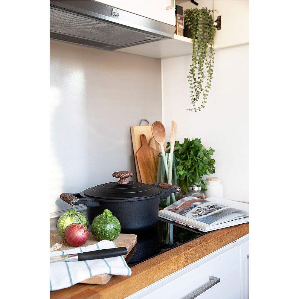 Σκεύος κατασκευασμένο από χυτό αλουμίνιο, Τριπλά ενισχυμένη εσωτερική αντικολλητική επίστρωση PFLUON ETERNUM, ιδιαίτερα ανθεκτική στη σκληρή χρήση ,Εργονομικές λαβές βακελίτη με φινίρισμα ξύλου για σταθερό κράτημα και άνετο μαγείρεμα,Χωρίς PFOA, χωρίς κάδ