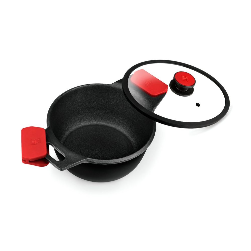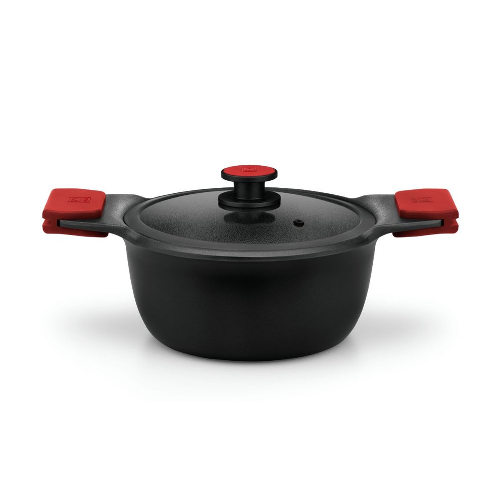 Κατσαρόλα χυτού αλουμινίου με παχύ πάτο 6 mm, αντικολλητική χωρίς PFOA για μαγείρεμα χωρίς λιπαρά και άριστη θερμική απόδοση. Κατάλληλη για όλες τις εστίες και φούρνο (έως 220°C), με καπάκι ενισχυμένου γυαλιού και εργονομική λαβή.
