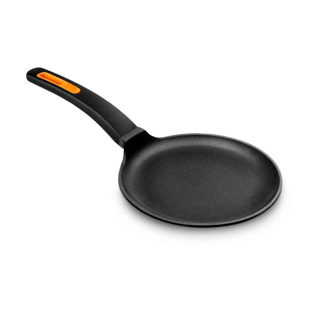 Τηγάνι κρεπιέρα από χυτό αλουμίνιο με αντικολλητική επίστρωση χωρίς PFOA και παχύ πάτο 6 mm για ομοιόμορφη κατανομή θερμότητας. Κατάλληλο για όλους τους τύπους εστιών, και εύκολο στο καθάρισμα.