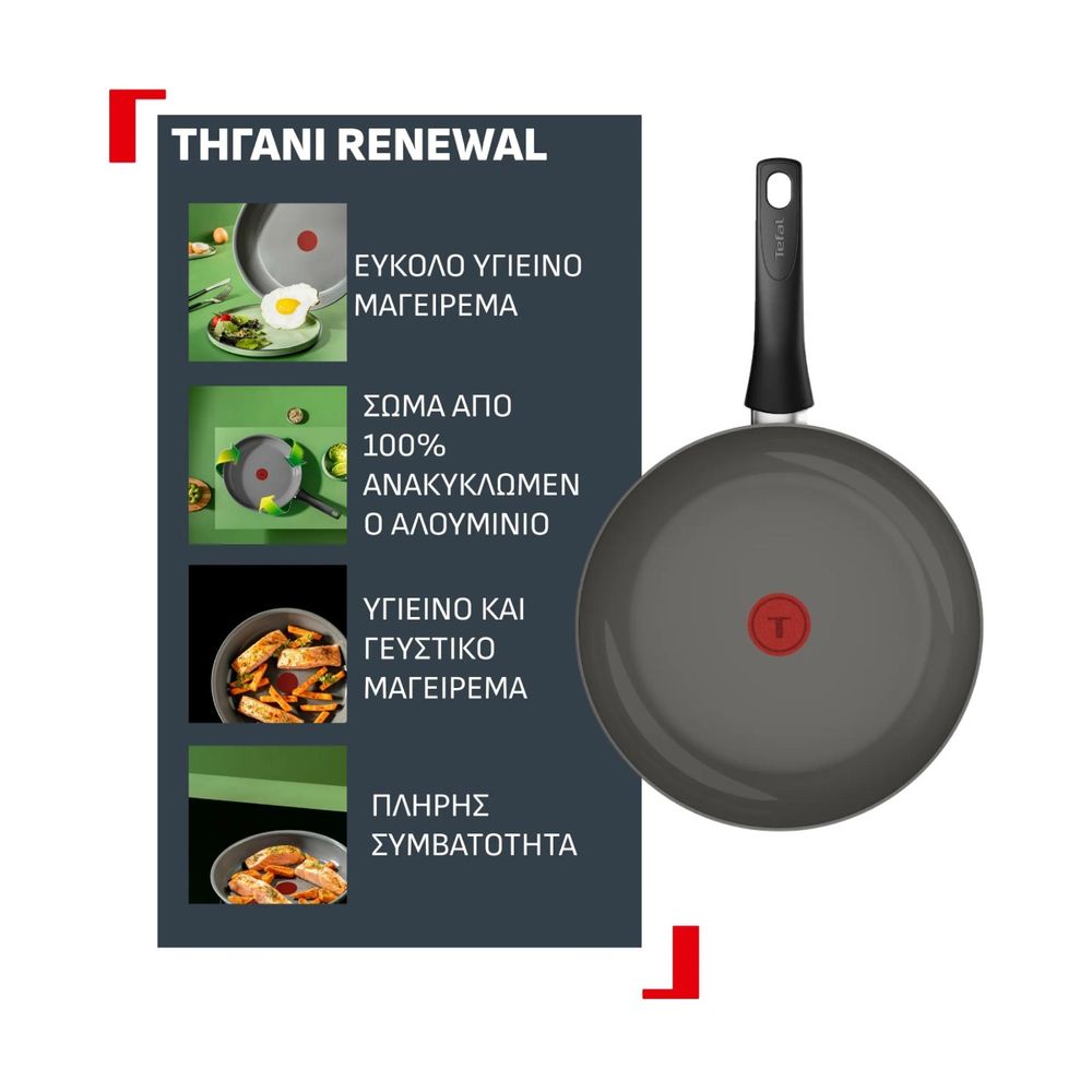 Απόλαυσε υγιεινό, σπιτικό μαγείρεμα με το Tefal Renewal 24cm αντικολλητικό τηγάνι. Γαλλικής κατασκευής από 100% ανακυκλωμένο αλουμίνιο, με κεραμική αντικολλητική επίστρωση Inoceram Glide για εύκολο μαγείρεμα με λίγα λιπαρά. Διαθέτει Thermo-Signal για ιδανική θερμοκρασία και είναι συμβατό με όλες τις εστίες, ακόμη και επαγωγικές