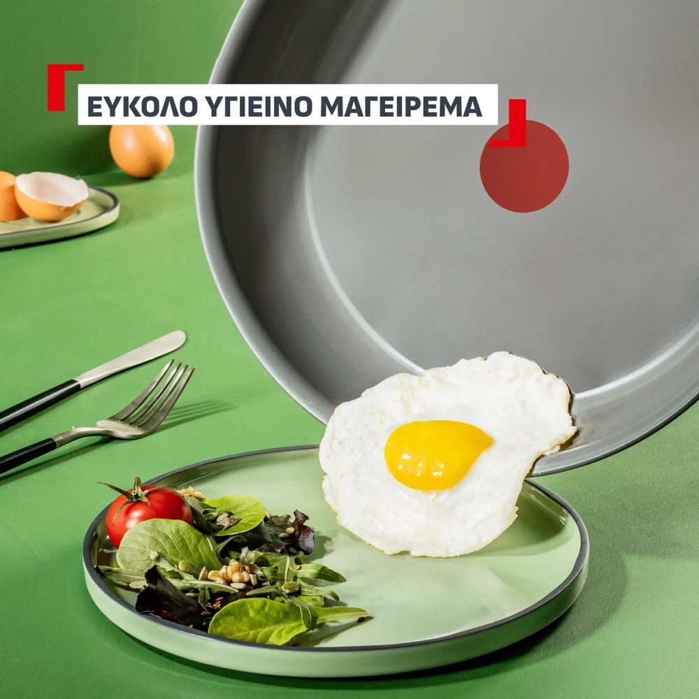 Σκεύος γαλλικής κατασκευής Tefal από 100% ανακυκλωμένο αλουμίνιο, με κεραμική αντικολλητική επίστρωση νέας γενιάς για υγιεινό μαγείρεμα με λίγα λιπαρά. Διαθέτει Thermo-Signal και είναι συμβατό με όλες τις εστίες, ακόμη και επαγωγικές.