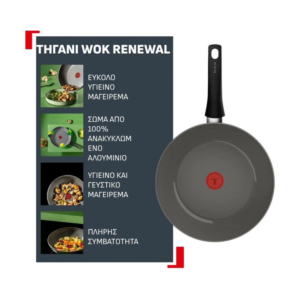 Σκεύος γαλλικής κατασκευής Tefal από 100% ανακυκλωμένο αλουμίνιο, με κεραμική αντικολλητική επίστρωση νέας γενιάς για υγιεινό μαγείρεμα με λίγα λιπαρά. Διαθέτει Thermo-Signal και είναι συμβατό με όλες τις εστίες, ακόμη και επαγωγικές.