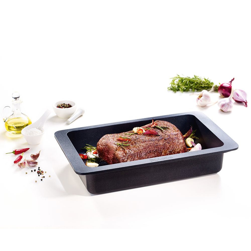 Ορθογώνιο ταψί gourmet μέγιστης χωρητικότητας 5 lt, φτιαγμένο από χυτό στο χέρι αλουμίνιο, σχεδιασμένο για φούρνους και εστίες, εκτός από εστίες αερίου και επαγωγικές. Ιδανικό για τηγάνισμα, σιγοβράσιμο και γκρατινάρισμα.