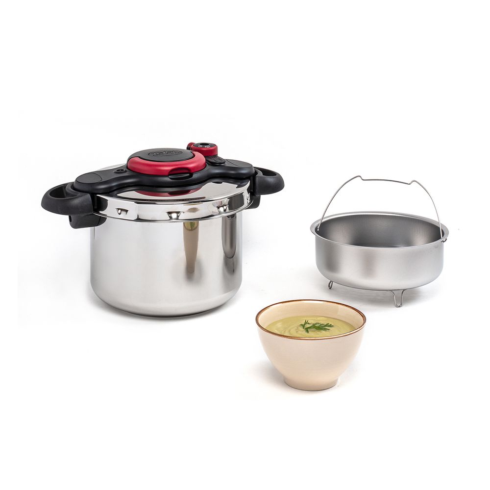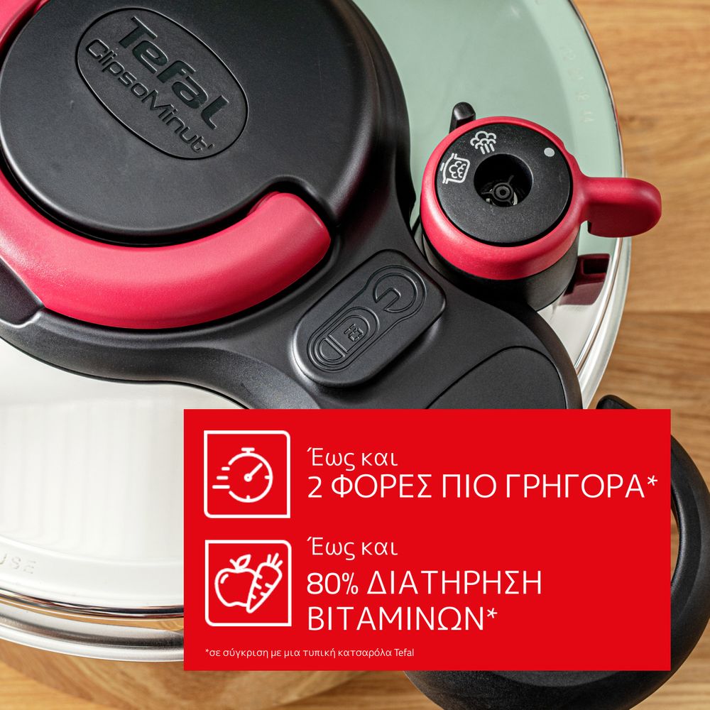 Από κρέας και ψάρι μέχρι λαχανικά ακόμα και επιδόρπια, η ClipsoMinut' Easy τα κάνει όλα, έως δύο φορές πιο γρήγορα σε σχέση με μια χύτρα ταχύτητας Tefal Clipso+. Είναι κατασκευασμένη από ανοξείδωτο ατσάλι για μεγάλη διάρκεια ζωής και με 10ετή εγγύηση για τον ανοξείδωτο κάδο, ενώ είναι 30% πιο ελαφριά σε σχέση με μια συμβατική χύτρα ταχύτητας. Με 6L χωρητικότητα, είναι ιδανική για την φροντίδα όλης της οικογένειας. Εύκολο άνοιγμα και κλείσιμο με το ένα χέρι.