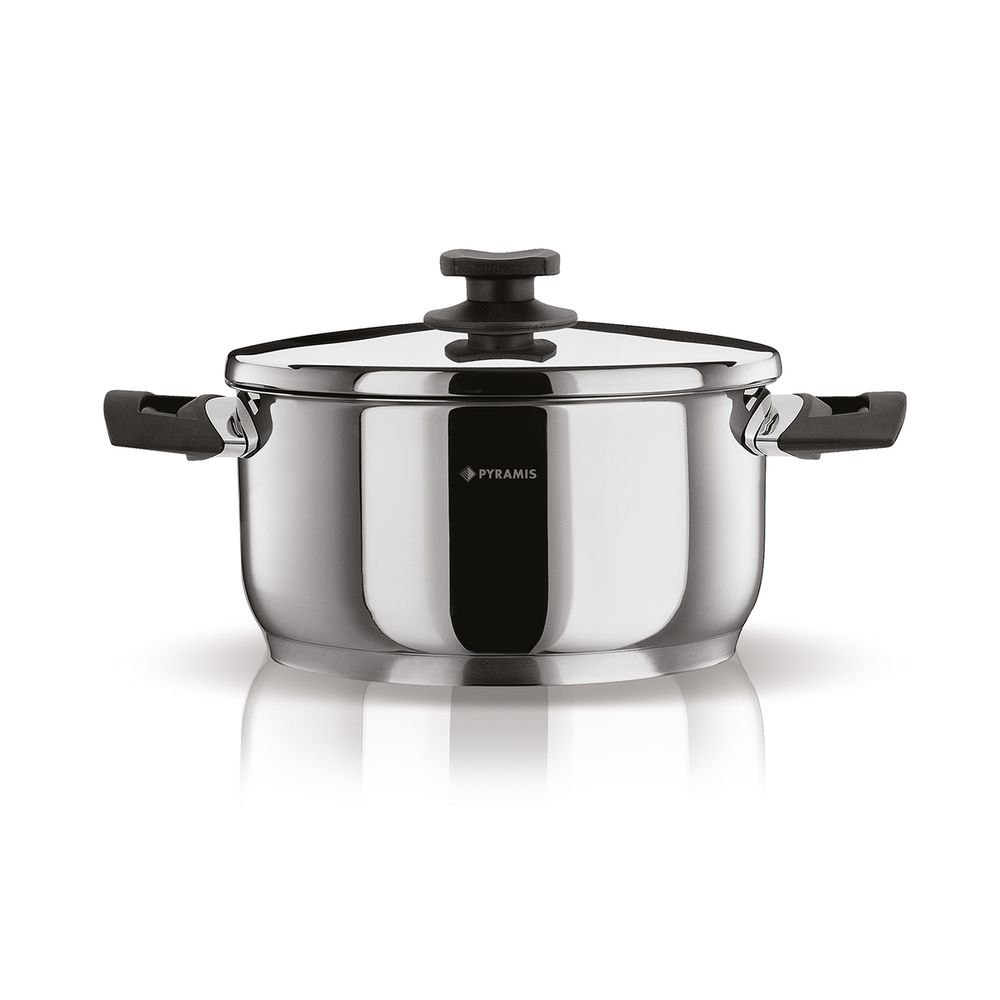 Μαγείρεψε μεγάλες ποσότητες με άνεση με τη χύτρα PYRAMIS 30 cm, 10,4 L. Κατασκευασμένη από ανοξείδωτο 18/10 με τριπλή θερμοσυσσωρευτική βάση για γρήγορη και ομοιόμορφη θέρμανση. Τα βακελιτικά χερούλια αντέχουν έως 220°C, ενώ το καμπύλο καπάκι διατηρεί υγρασία και γεύση. Με τέλεια εφαρμογή στις εστίες και συμβατότητα με όλες τις επιφάνειες, ακόμη και επαγωγικές.