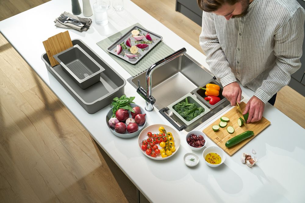 Σετ αξεσουάρ Franke 8 τεμαχίων, που ταιριάζουν σε κάθε νεροχύτη έως 54cm. Περιλαμβάνει ανοξείδωτο τηλεσκοπικό βραχίονα, επιφάνεια κοπής, στραγγιστικά μπωλ, μικρό αποθηκευτικό μπωλ, καπάκι, στραγγιστική επιφάνεια σιλικόνης και μεγάλο δοχείο αποθήκευσης.