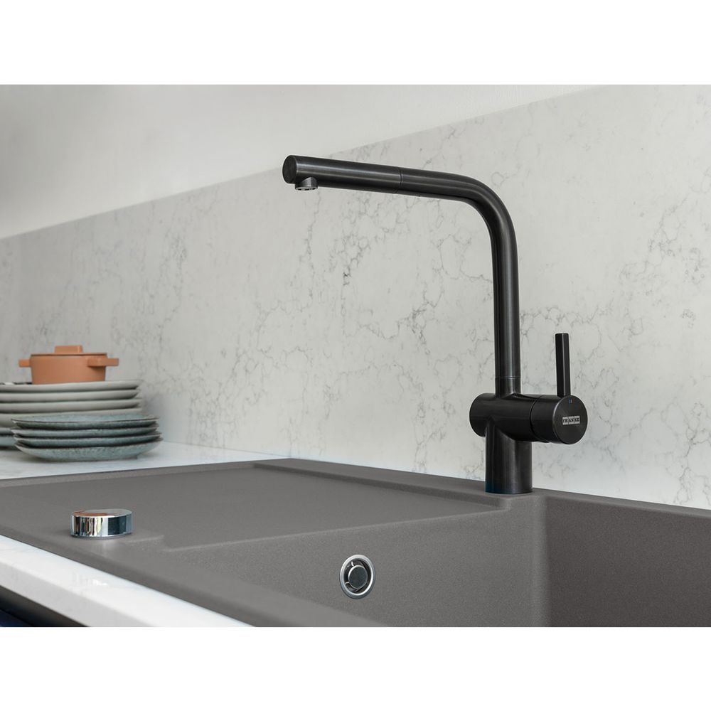Atlas Neo Ντους Black μπαταρία κουζίνας από τη Franke κατασκευασμένη από ανοξείδωτο υλικό και με μοναδικό πρωτότυπο σχεδιασμό. Η απόχρωση της ταιριάζει απόλυτα με κάθε είδους νεροχύτη και στυλ κουζίνας.