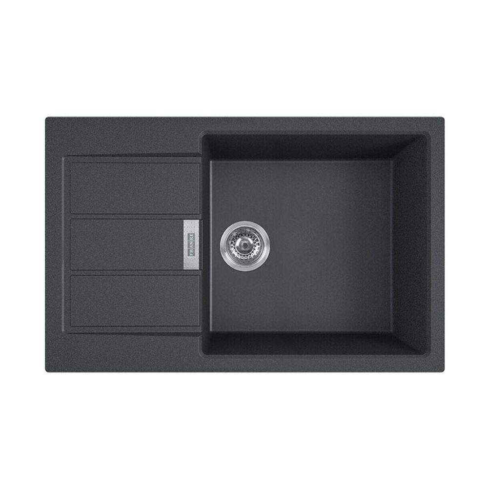 Συνθετικός νεροχύτης Sirius 2.0 611-78XL (435) 780x435mm, με 1 γούρνα, αντιστρεφόμενη ποδιά, ένθετος, carbon black, με σιφόνι και βαλβίδα και ελάχιστο μέγεθος ντουλαπιού 60cm.