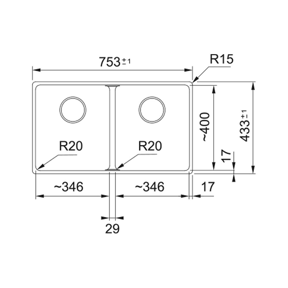 Γρανιτένιος νεροχύτης Maris Bowl MRG 120-35-35 760x433mm, με 2 γούρνες, χωρίς ποδιά, υποκαθήμενος, με αυτόματη βαλβίδα, ελάχιστο μέγεθος ντουλαπιού 80cm.