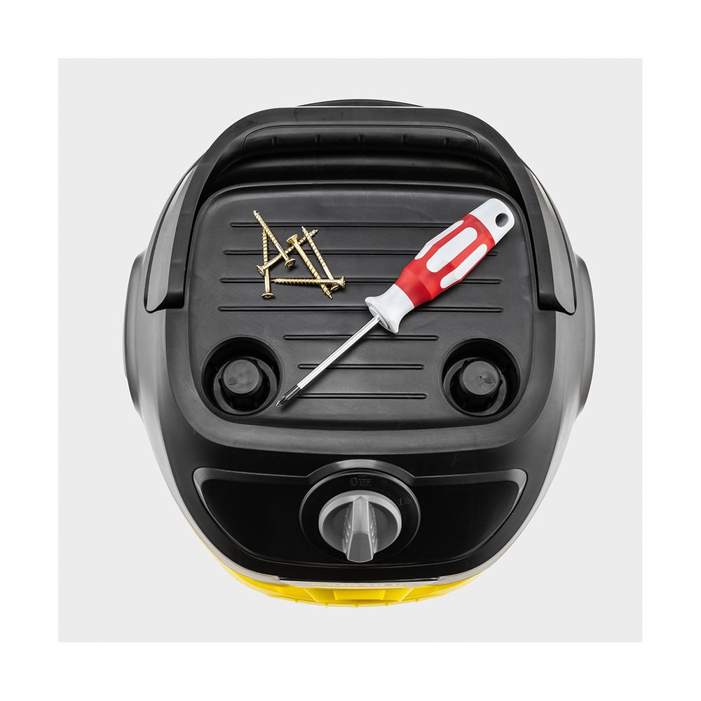 Η συμπαγής ηλεκτρική σκούπα υγρής και ξηρής αναρρόφησης WD 1 V-12/2/18 διαθέτει πλαστικό κάδο 12 λίτρων, καλώδιο 2 μέτρων, σωλήνα αναρρόφησης μήκους 1,8 μέτρων και λειτουργία φυσητήρα. Ο αποθηκευτικός χώρος στην κεφαλή του μηχανήματος χρησιμοποιείται για την ασφαλή αποθήκευση εργαλείων και μικρών εξαρτημάτων όπως βίδες και καρφιά. Επιπλέον, το μηχάνημα διαθέτει χώρο αποθήκευσης των αξεσουάρ του.