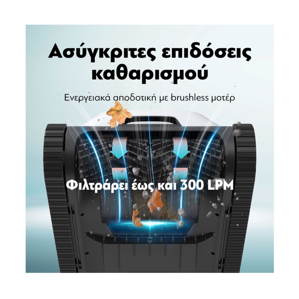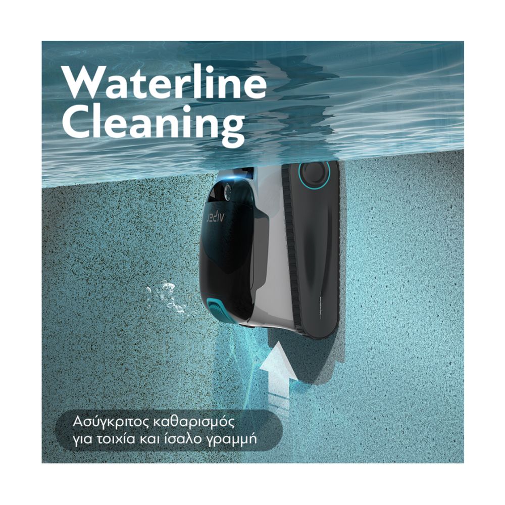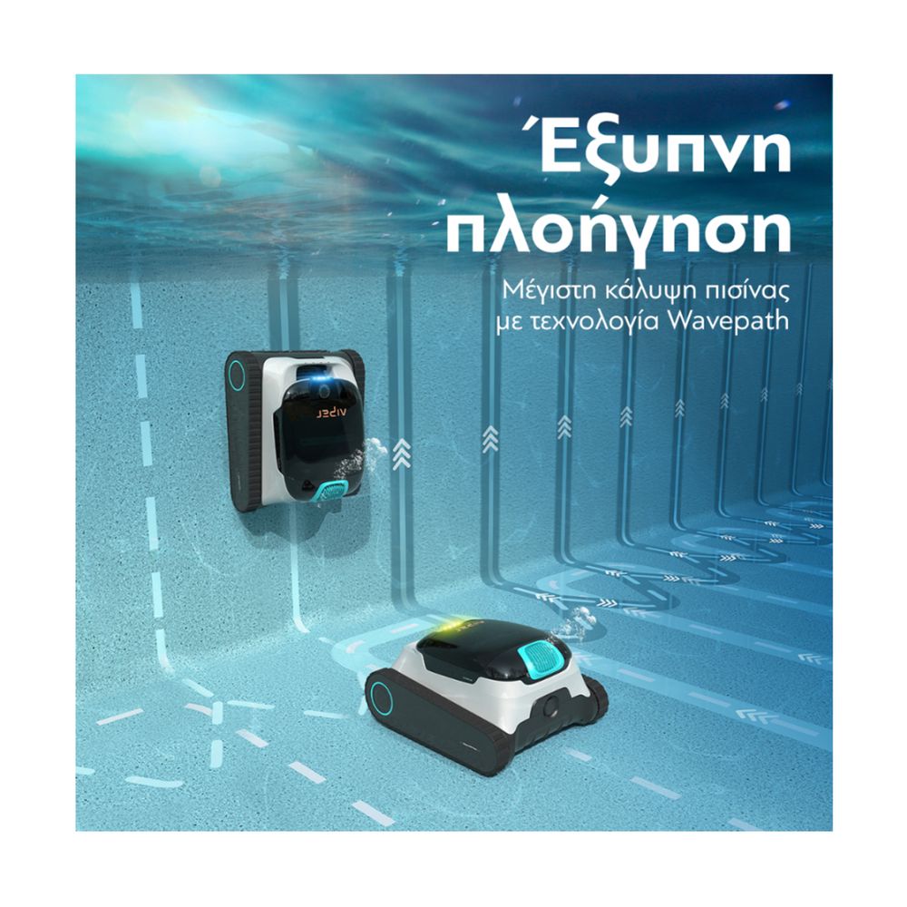 Τύπος πισίνας: Με κλίση | Τοίχοι, Waterline, Πυθμένας (μέγιστη κλίση 45°) - Κατάλληλη για επιφάνειες από: Τσιμέντο, Βινύλιο, Γύψος/Σοβάς, Υαλοβάμβακας, Μωσαικό - Μέγεθος πισίνας: έως 150τ.μ. (15m μήκος) - Αυτονομία μπαταρίας: έως 150 λεπτά - Διάρκεια φόρτισης: 3-4 ώρες - Ισχύς απορρόφησης: 300LPM - Χωρητικότητα Κάδου Φίλτρου: 3.5L - Tri-motor System - Active PVC Roller Βούρτσα - WavePath™ 2.0 Intelligent πλάνο διαδρομής. Εξαρτήματα: 1x Hook ανάκτησης - 2× Extra PVC Βούρτσες