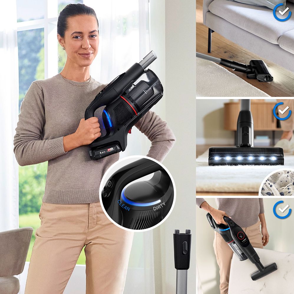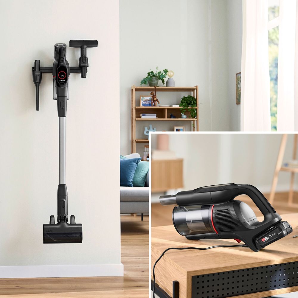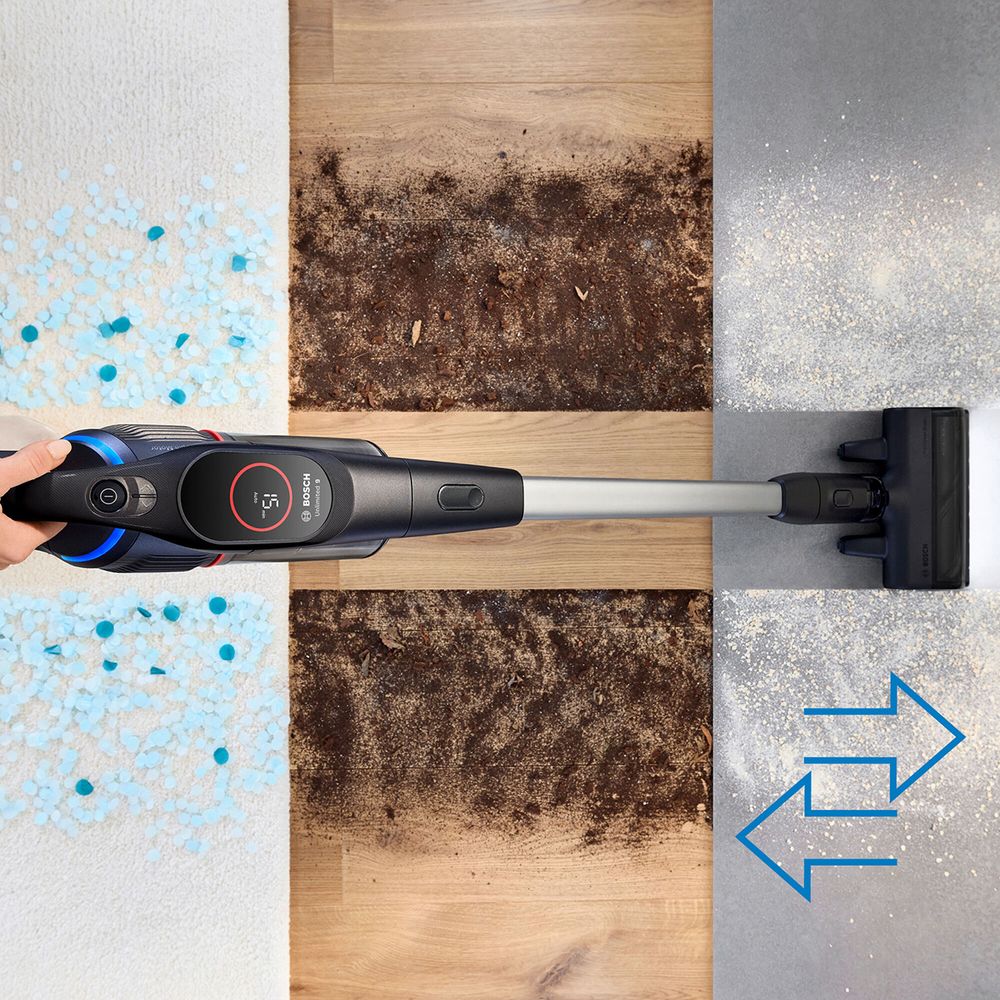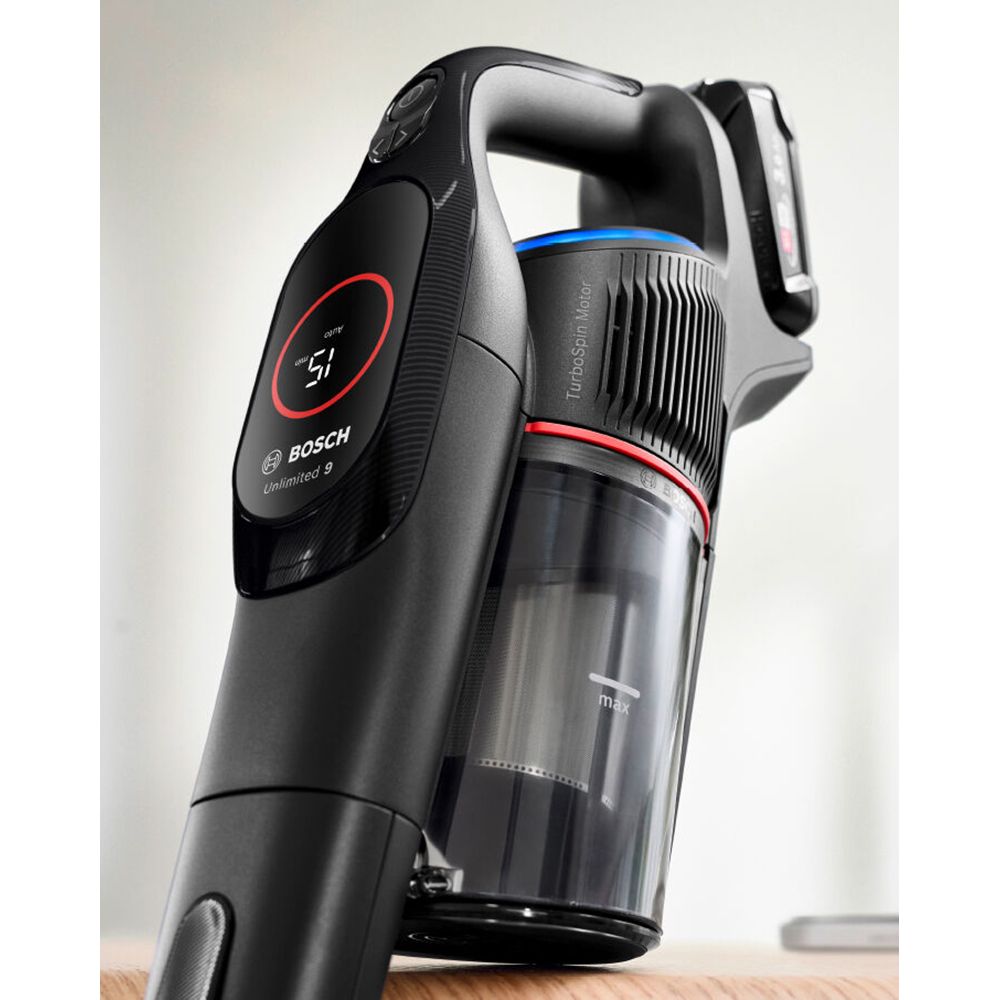 Επαναφορτιζόμενη πανίσχυρη σκούπα stick Bosch Unlimited 9 BSS931BHF με μπαταρία μεγάλης χωρητικότητας ενέργειας, τεχνολογία MicroClean που καθαρίζει ακόμα και τη σκόνη που δεν βλέπουμε και σύστημα φιλτραρίσματος HEPA που φιλτράρει 99,99% των σωματιδίων σκόνης και αποτρέπει την επανακυκλοφορία τους στον χώρο.