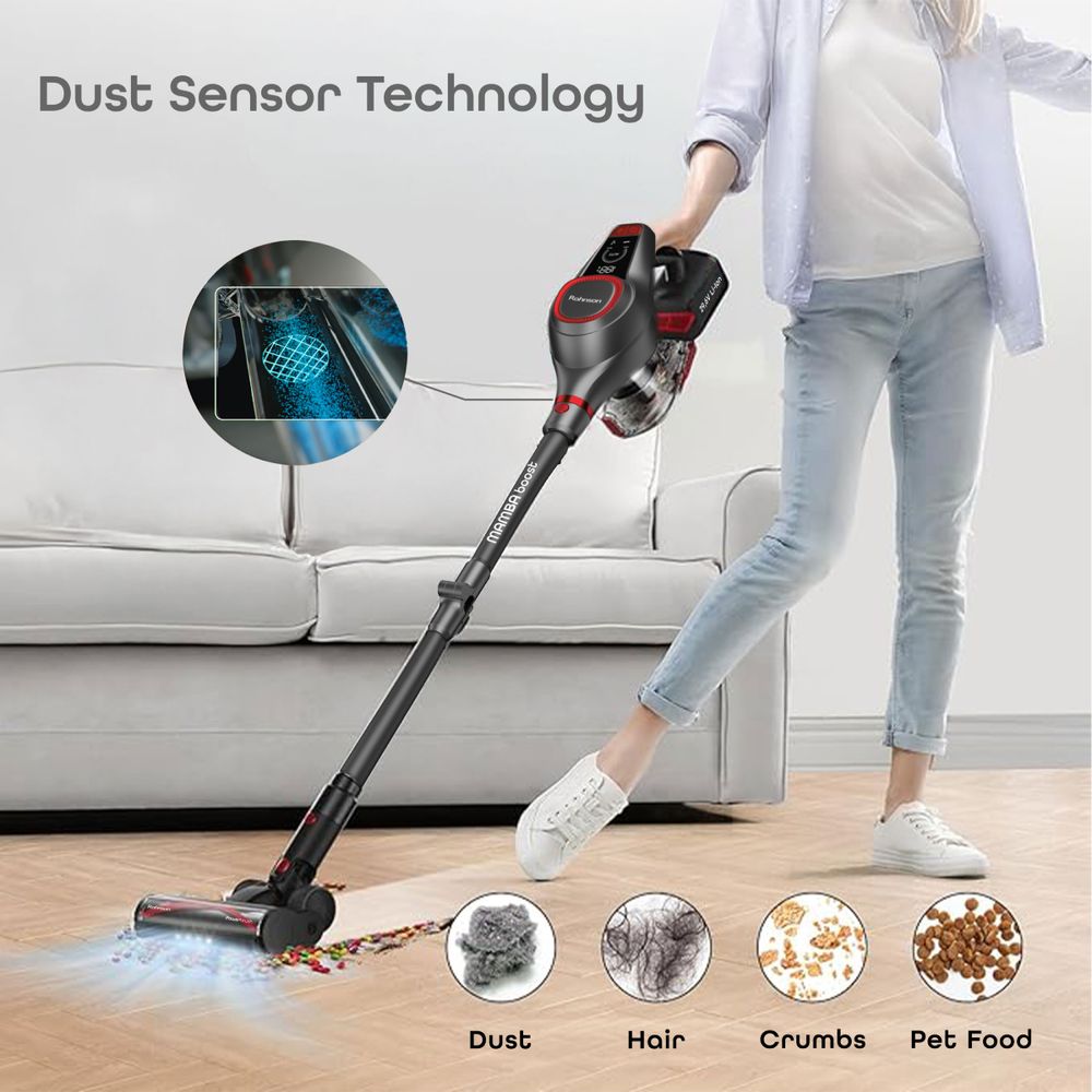 465W (BLDC), Έως 60 λεπτά διάρκεια, με τη χρήση πέλματος Αισθητήρας σκόνης για τον έλεγχο απορροφητικότητας Χωρητικότητα μπαταρίας 2200 mAh, 29,6V, Σταθερή απορροφητική ισχύς έως 190AW Απορροφητική πίεση 32kpa Κυκλωνική τεχνολογία χωρίς σακούλα 2 σε 1 : όρθια και σκουπάκι χειρός Aναδιπλούμενος σωλήνας Επιτοίχια βάση στήριξης Προηγμένο σύστημα φιλτραρίσματος HEPA 13 Καθαρισμός πολλαπλών επιφανειών Eξαρτήματα: Φωτιζόμενο πέλμα σκουπίσματος με bristle roller & soft roller, μίνι μηχανοκίνητο εξάρτημα, εξάρτημα για γωνίες, σύνθετο εξάρτημα Φορτιστής (4.5-5h) Χαμηλά επίπεδα θορύβου