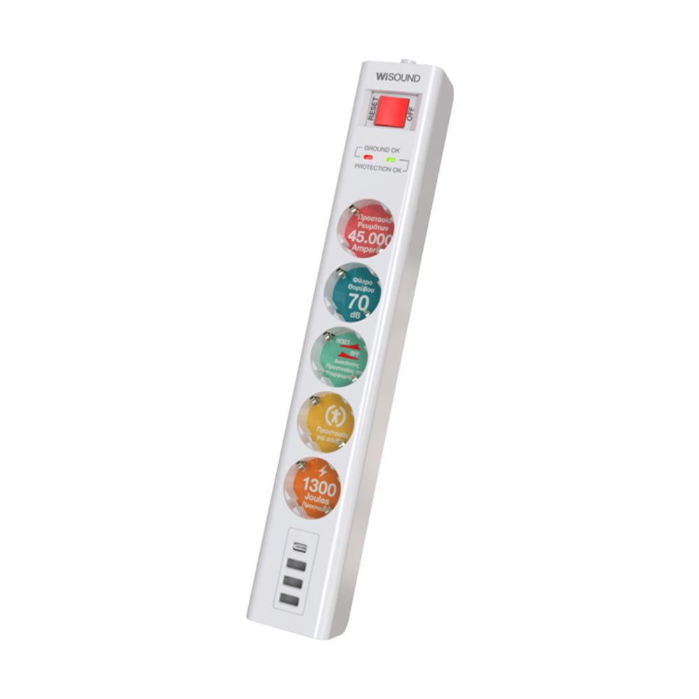WiSound SU1600-531R 5 Θέσεων 3x USB-A 1x USB-C Πολύπριζο Ασφαλείας