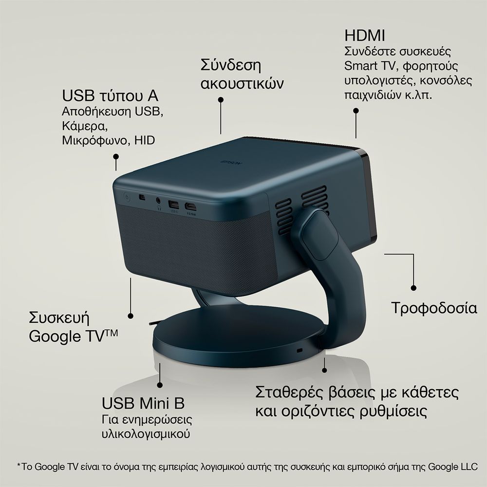 Απόλαυσε καθηλωτική προβολή στο σπίτι ή εν κινήσει για έως και 10 χρόνια. Με την τεχνολογία 3LCD της Epson, οι εικόνες είναι καθαρές και ευκρινείς. Απόλαυσε έξυπνες λύσεις με Google TV και ηχεία Bluetooth. Με έξυπνες λύσεις και 2 ηχεία 5W με συνδεσιμότητα Bluetooth, είναι η ιδανική λύση για άμεση ψυχαγωγία στο σπίτι ή εν κινήσει. Απλά περίστρεψε τη βάση για πιο ευέλικτες λύσεις προβολής.