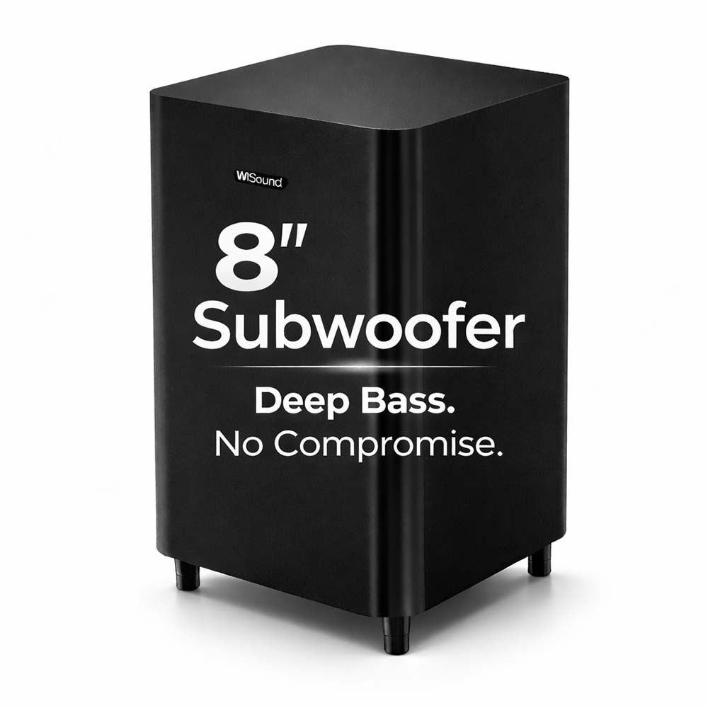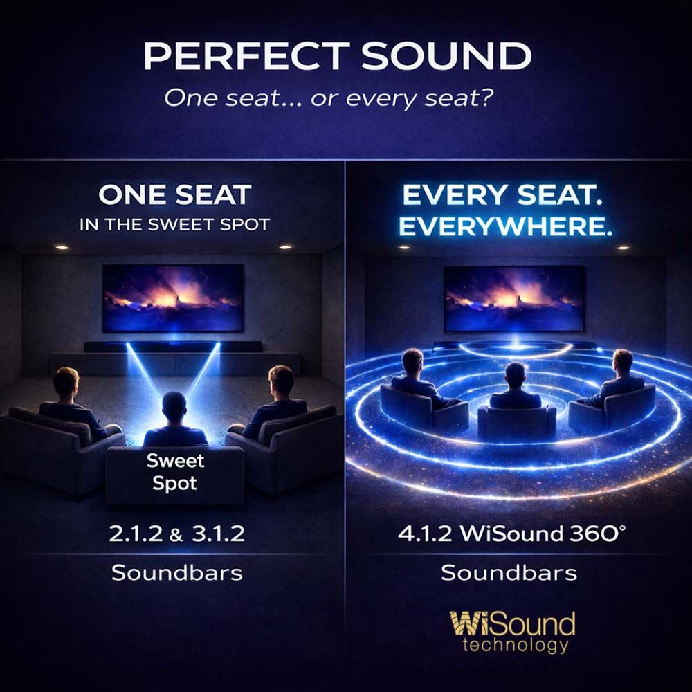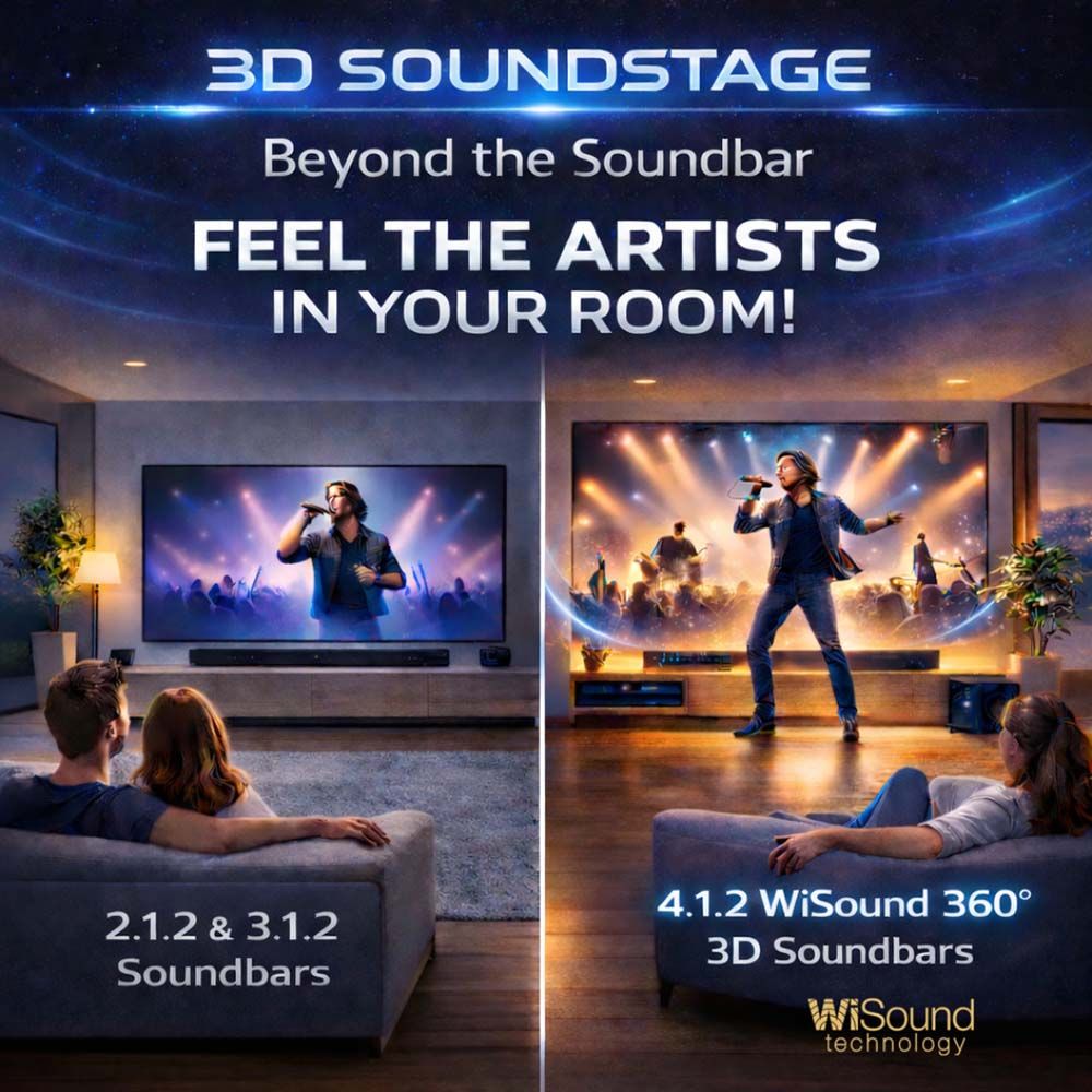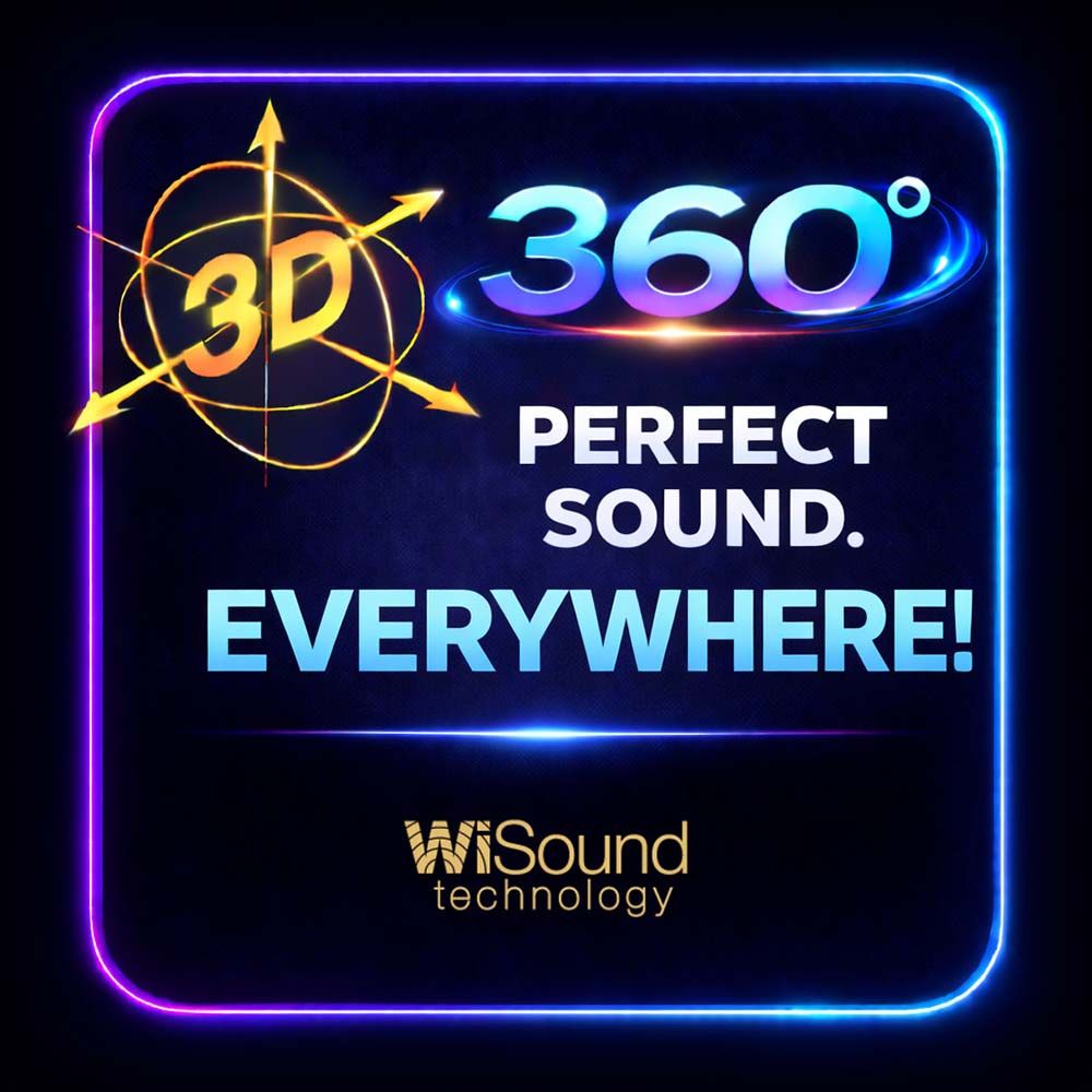 4.1.2 Ακουστικά κανάλια με 7 Μεγάφωνα Τρισδιάστατης διασποράς, Yπογούφερ 8" πολύ μεγάλης διαδρομής για βαθύ και δυναμικό μπάσο, Τεχνολογία WiSound 3D-360° για εντυπωσιακό τέλειο ήχο, που γεμίζει όλο το δωμάτιο — όπου κι αν κάθεσαι