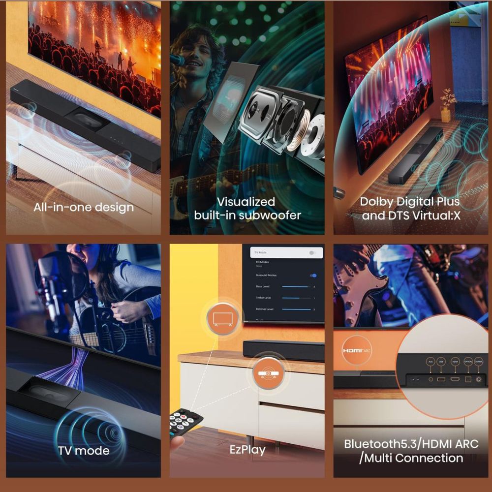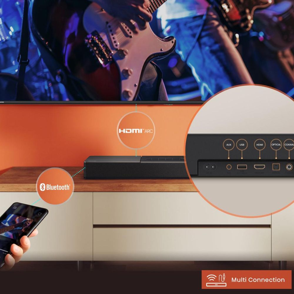 Αναβάθμισε τον ήχο της τηλεόρασής σου με το Hisense HS2000 2.1 soundbar όλα-σε-ένα. Με συνολική ισχύ 240W, ενσωματωμένο subwoofer και Dolby Audio, προσφέρει καθαρό ήχο και γεμάτα μπάσα χωρίς extra εξοπλισμό. Οι τεχνολογίες Dolby Digital Plus και DTS Virtual:X δημιουργούν εικονικό surround, ενώ οι συνδέσεις Bluetooth 5.3 και HDMI ARC εξασφαλίζουν εύκολη χρήση και άμεση απόλαυση.