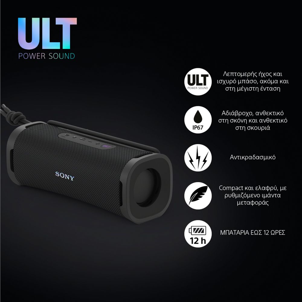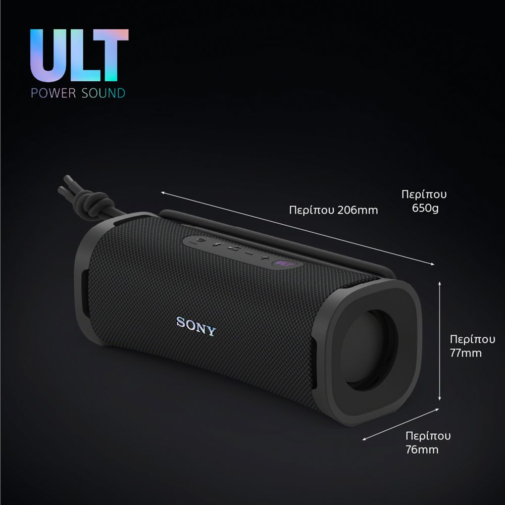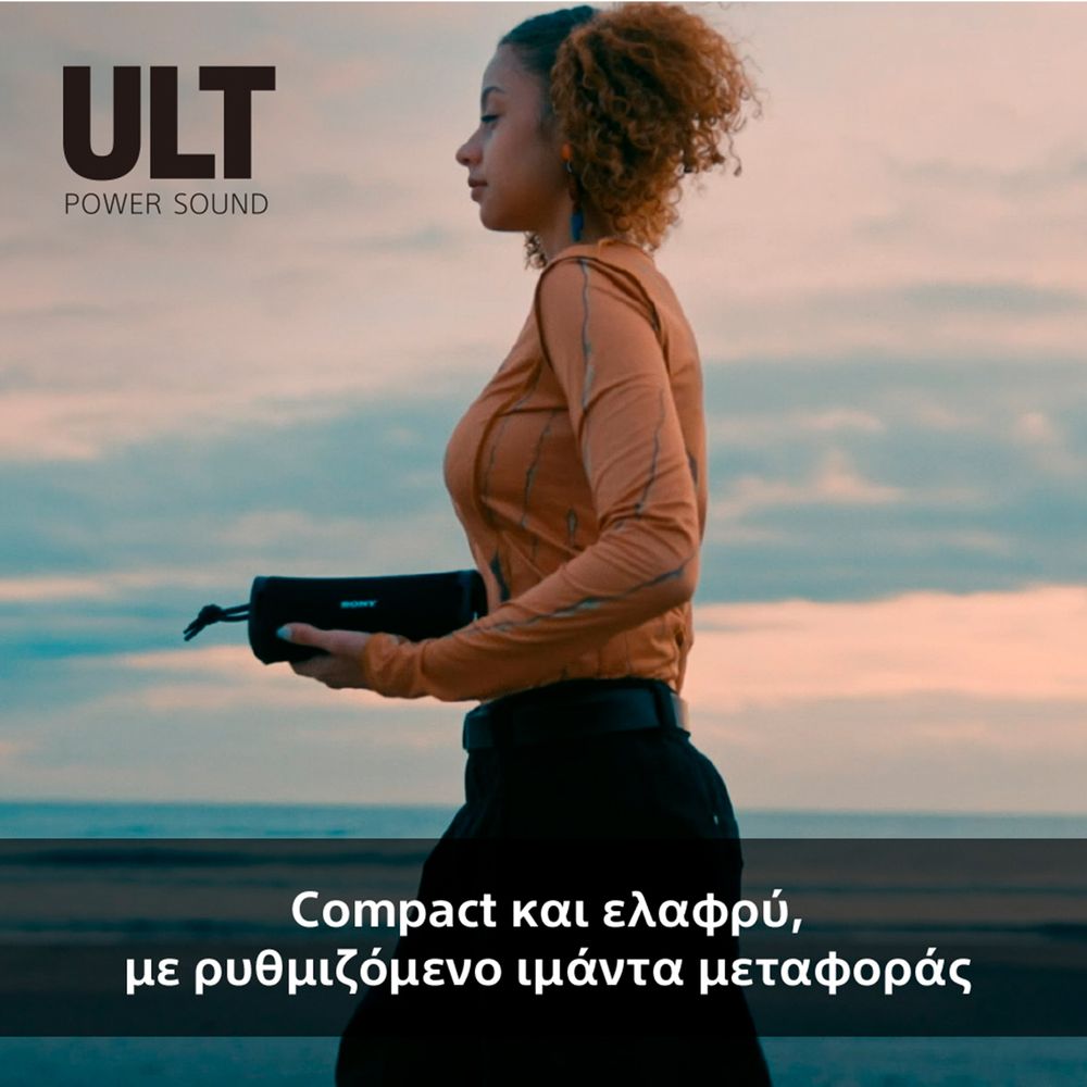 Sony ULT FIELD 1, το μικρότερο, φορητό ηχείο της σειράς ULT POWER SOUND. Μπορεί να είναι μικρό, αλλά παράγει τεράστιο, εντυπωσιακό ήχο χρησιμοποιώντας έναν συνδυασμό ενός ισχυρού γούφερ, ενός τουίτερ υψηλής ποιότητας και δύο παθητικών ακτινοβολητών για την ενίσχυση των μπάσων.