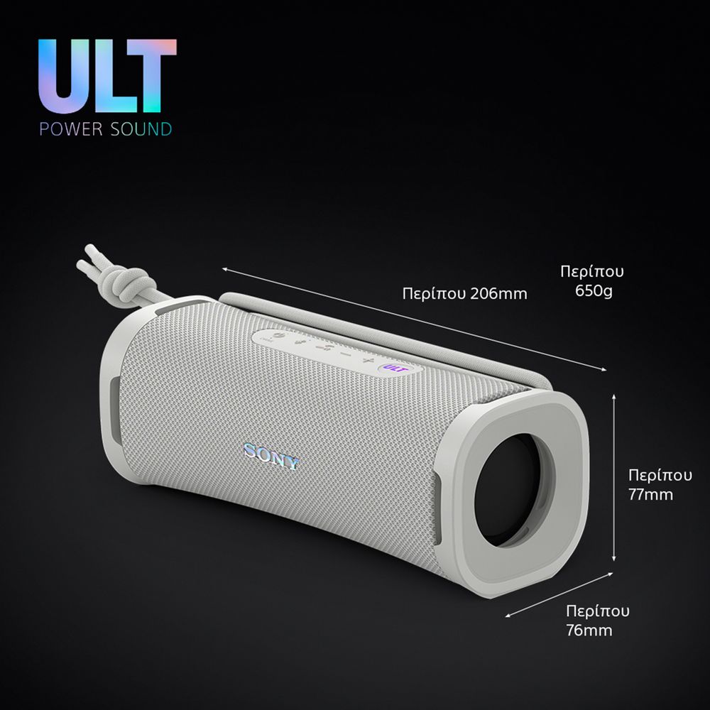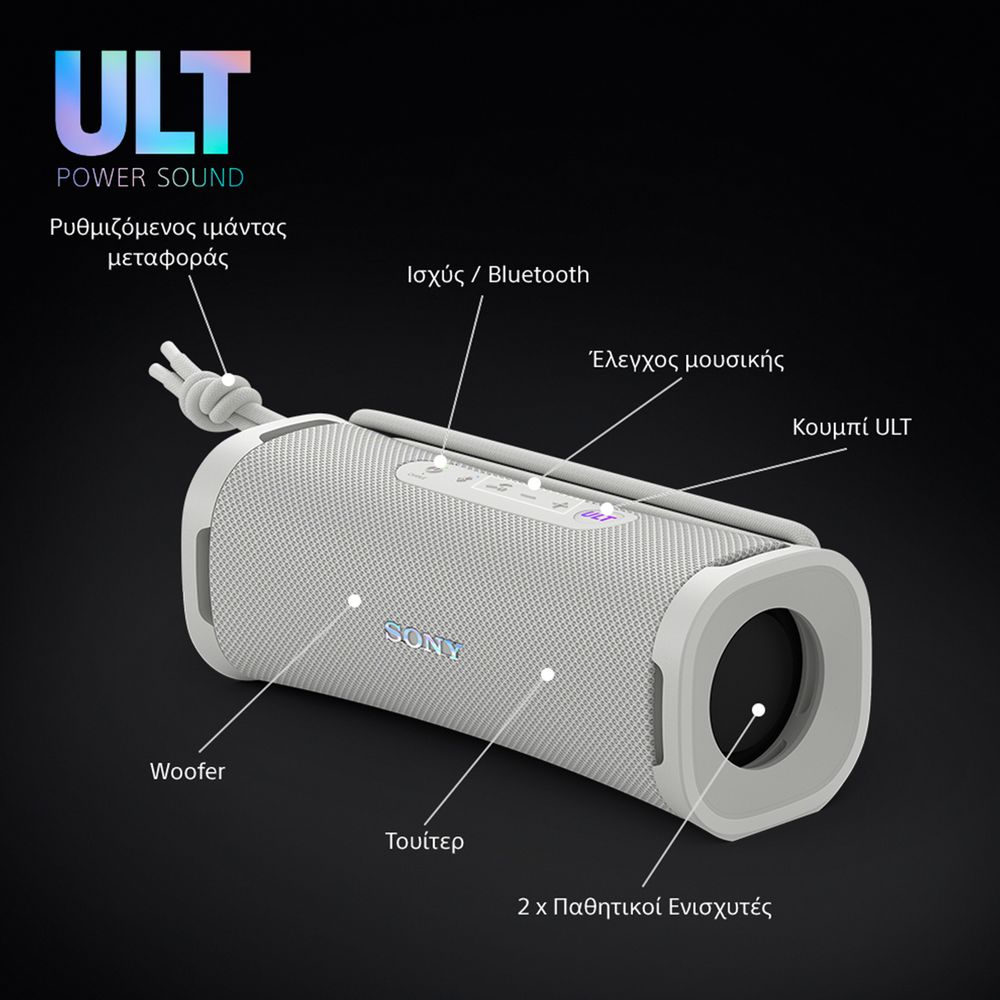 Sony ULT FIELD 1, το μικρότερο, φορητό ηχείο της σειράς ULT POWER SOUND. Μπορεί να είναι μικρό, αλλά παράγει τεράστιο, εντυπωσιακό ήχο χρησιμοποιώντας έναν συνδυασμό ενός ισχυρού γούφερ, ενός τουίτερ υψηλής ποιότητας και δύο παθητικών ακτινοβολητών για την ενίσχυση των μπάσων.