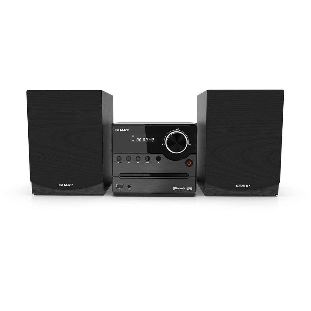 Μικρό στερεοφωνικό από τη Sharp, μαύρου χρώματος, με Bluetooth, CD, συμβατό με mp3, ψηφιακό ραδιόφωνο, μία υποδοχή USB 2.0, oθόνη LCD επάνω στη μονάδα και ρολόι.