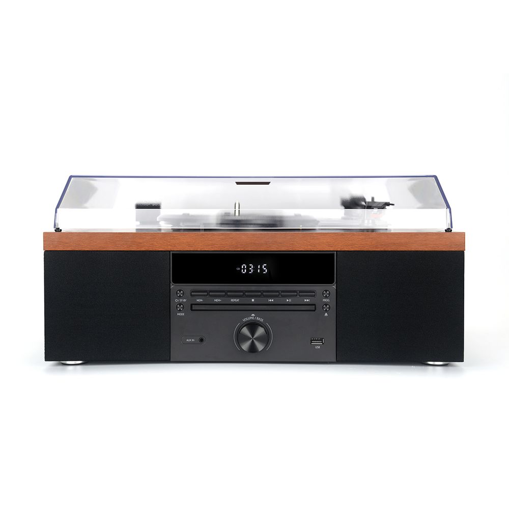 Ηχοσύστημα με πικάπ και ενσωματωμένα ηχεία. Στολίζει το χώρο σου με την κατασκευή του από ξύλο και διαθέτει ενσωματωμένα ηχεία 10 W (2 x 5 W). Δέχεται δίσκους 7, 10 και 12 ιντσών (33.3, 45 και 78 στροφών), από USB stick, από άλλη συσκευή μέσω Aux-In, ασύρματα μέσω Bluetooth 5.0 ή τον αγαπημένο σου ραδιοφωνικό σταθμό. Σύνδεσε το πικάπ μέσω καλωδίου RCA ή ασύρματα μέσω Bluetooth με ηχεία ή ενισχυτή για ακόμα πιο δυνατό και καθαρό ήχο.