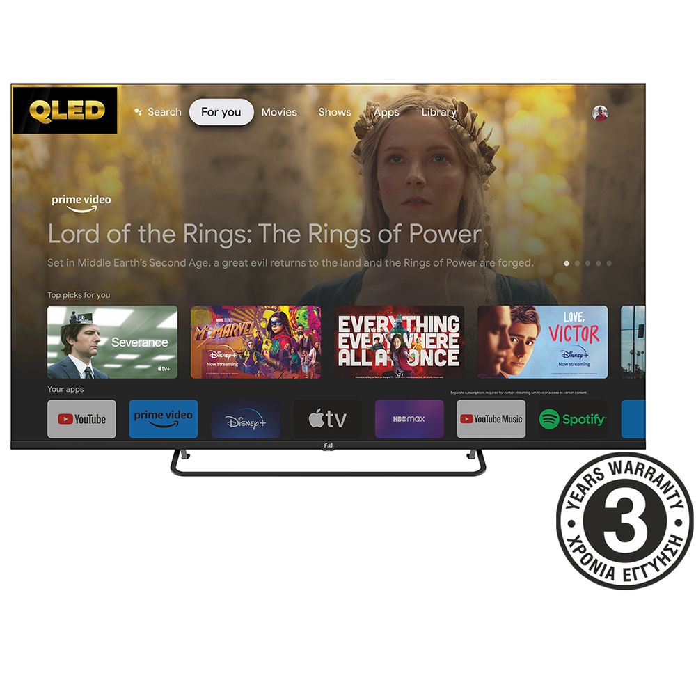 Η τηλεόραση QLED της F&U είναι μια Google TV που προσφέρει εξαιρετική ποιότητα εικόνας και ήχου. Με τεχνολογία HDR10 και ανάλυση Ultra HD 4K, εξασφαλίζει ζωντανά χρώματα και καθαρή απεικόνιση. Απόλαυσε τα αγαπημένα σου προγράμματα στις πλατφόρμες Netflix και Prime Video, ή σύνδεσε την εξωτερική σου συσκευή αποθήκευσης και παρακολούθησε μέσω του media player.