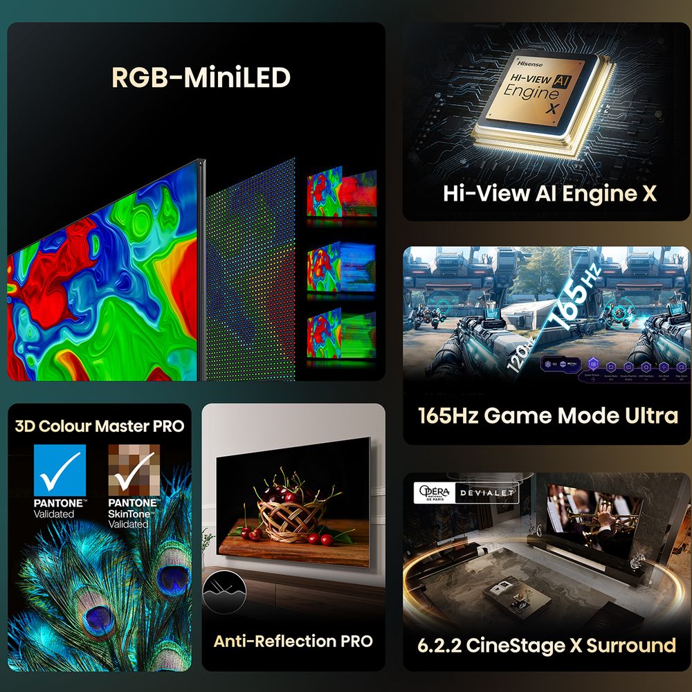 Με την Hisense 100UXQ ζεις την επανάσταση στην εικόνα με RGB-MiniLED έως 8000 nits, Pantone Validated χρώματα και AI Chroma Light Sensor που προσαρμόζει φωτεινότητα και τόνους σε κάθε χώρο. Ο Hi-View AI Engine X αποδίδει ρεαλισμό σε εικόνα και ήχο, ενώ το Anti-Reflection PRO κρατά την προβολή καθαρή. Απόλαυσε 165Hz Game Mode Ultra, Dolby Vision Atmos και ήχο Devialet 6.2.2 για εμπειρία κινηματογράφου και gaming νέας γενιάς.