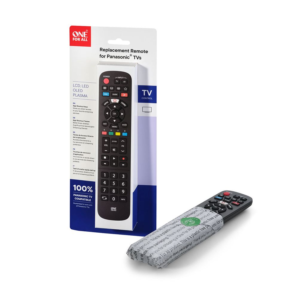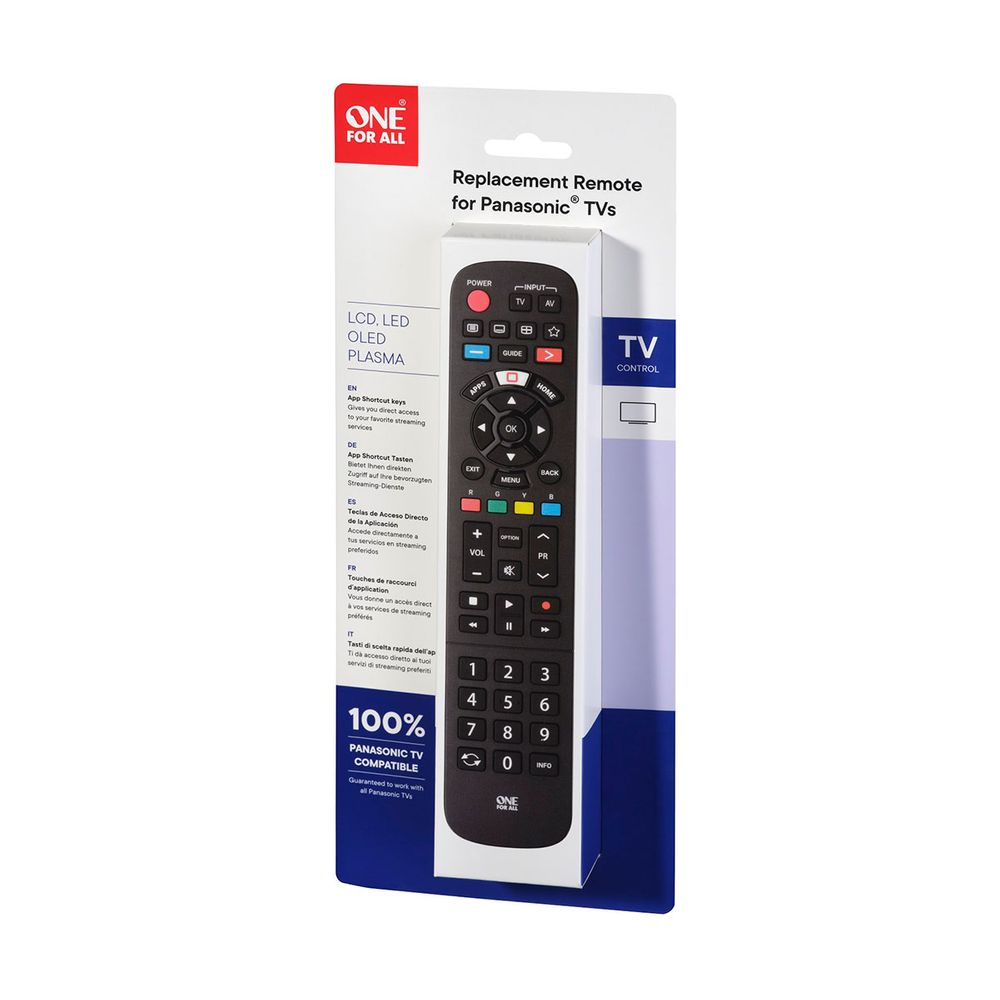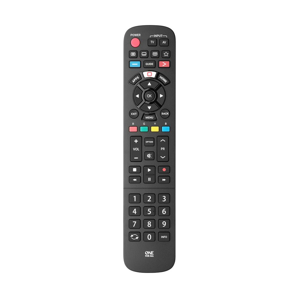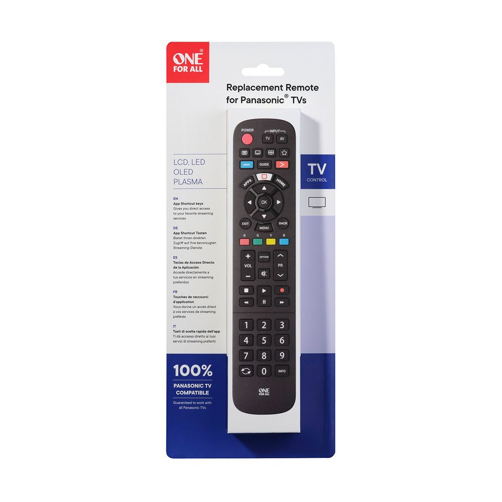 Τηλεχειριστήριο One for All URC4914 για τηλεοράσεις Panasonic και άμεση λειτουργία, χωρίς προγραμματισμό, με δυνατότητα εκμάθησης λειτουργιών από το παλιό τηλεχειριστήριο και πλήκτρο Application για γρήγορη πρόσβαση σε υπηρεσίες streaming. Η μέγιστη απόσταση χρήσης του είναι τα 20 μέτρα.