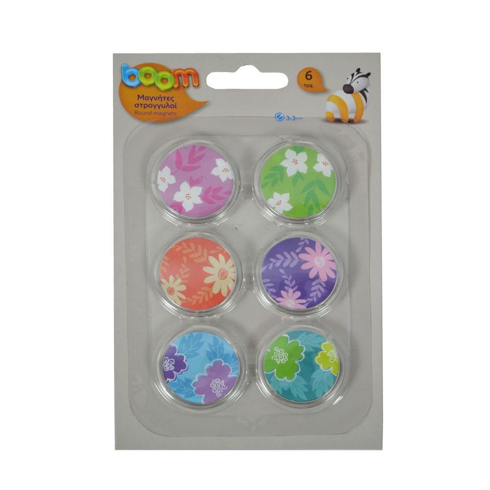 Μαγνήτες στρογγυλοί Boom. Διάμετρος τεμαχίου: 3,3cm. Η συσκευασία περιλαμβάνει 6 floral μαγνήτες. Στερέωσε τις αγαπημένες σου φωτογραφίες ή άφησε ένα μήνυμα στους αγαπημένους σου και δώσε χρώμα στην καθημερινότητά σου!