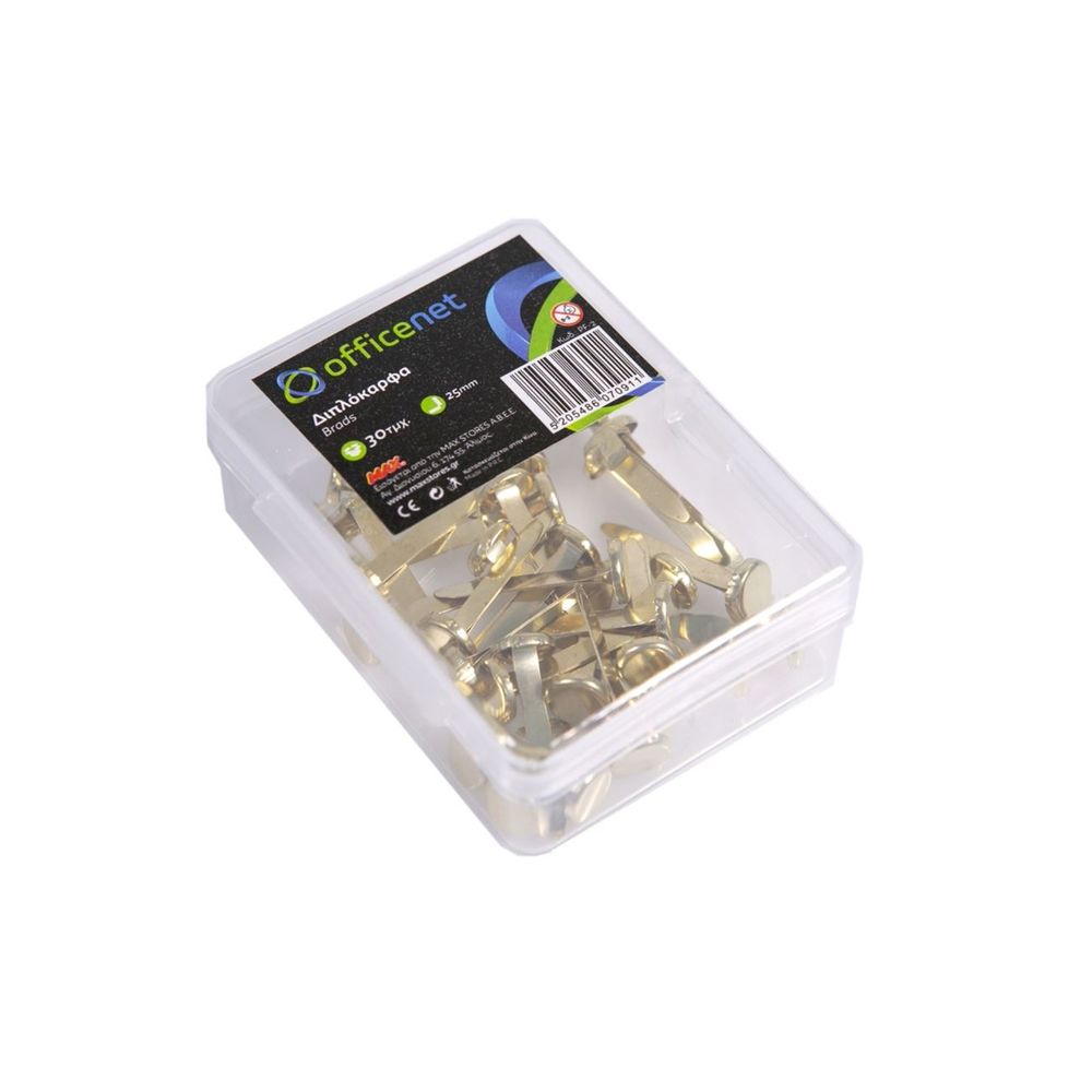 Διπλόκαρφα κλιπ Officenet με χρυσή επίστρωση, ιδανικά για επαγγελματική χρήση και οργάνωση εγγράφων. Η συσκευασία περιλαμβάνει 30 τεμάχια μήκους 25mm, προσφέροντας ασφαλή συγκράτηση των χαρτιών σου.