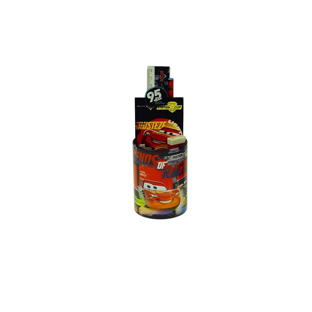 Σχολικό σετ δώρου Cars με μεταλλική μολυβοθήκη που περιέχει μπλοκάκι, γόμα, μολύβι, χάρακα, κλιπ και ξύστρα.