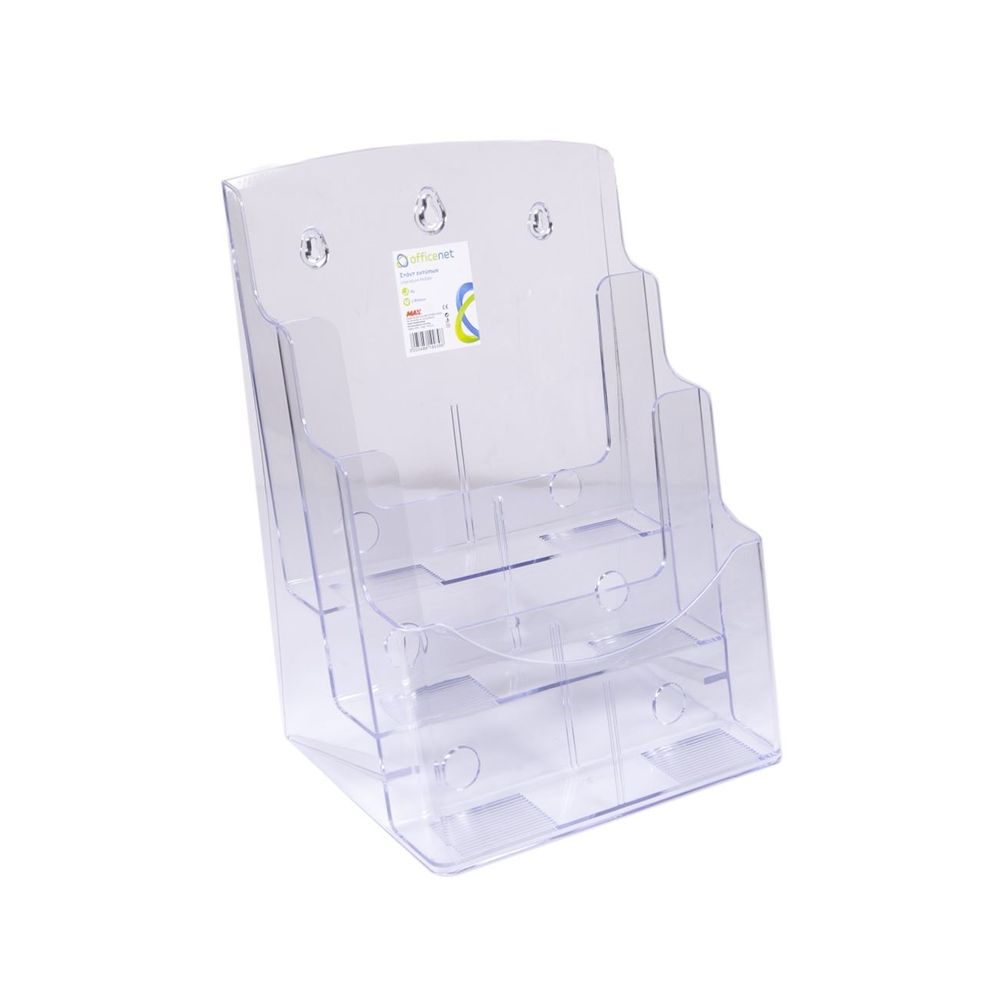 Στάντ εντύπων Α4 3 θέσεων από διαφανές πλαστικό, με διαστάσεις 21 x 29 cm. Ιδανικό για την οργάνωση και προβολή των εντύπων σου στο γραφείο ή την επιχείρησή σου. Διαθέτει τρεις θέσεις για άμεση πρόσβαση στα έγγραφά σου.
