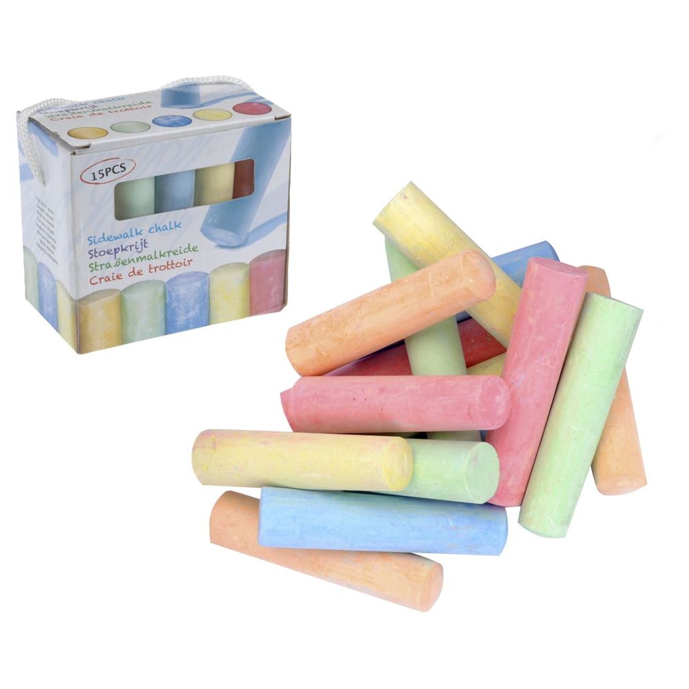 Χρωματιστές κιμωλίες σε συσκευασία 15 τεμαχίων, ιδανικές για παιδικό παιχνίδι και δημιουργική απασχόληση σε εξωτερικούς χώρους. Με διαστάσεις 9.7 x 2 cm, προσφέρουν άνετο κράτημα για ατελείωτες ώρες ζωγραφικής στο πεζοδρόμιο.