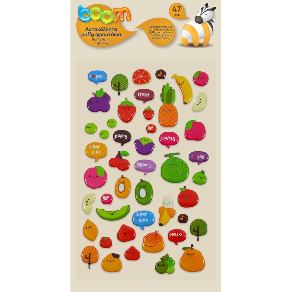 Αυτοκόλλητα puffy φρουτάκια Boom. Η συσκευασία περιέχει 47 αυτοκόλλητα! Οι πιο ξεχωριστές φρουτοφατσούλες για να διακοσμήσεις βιβλία, τετράδια και ό,τι άλλο μπορείς να φανταστείς!